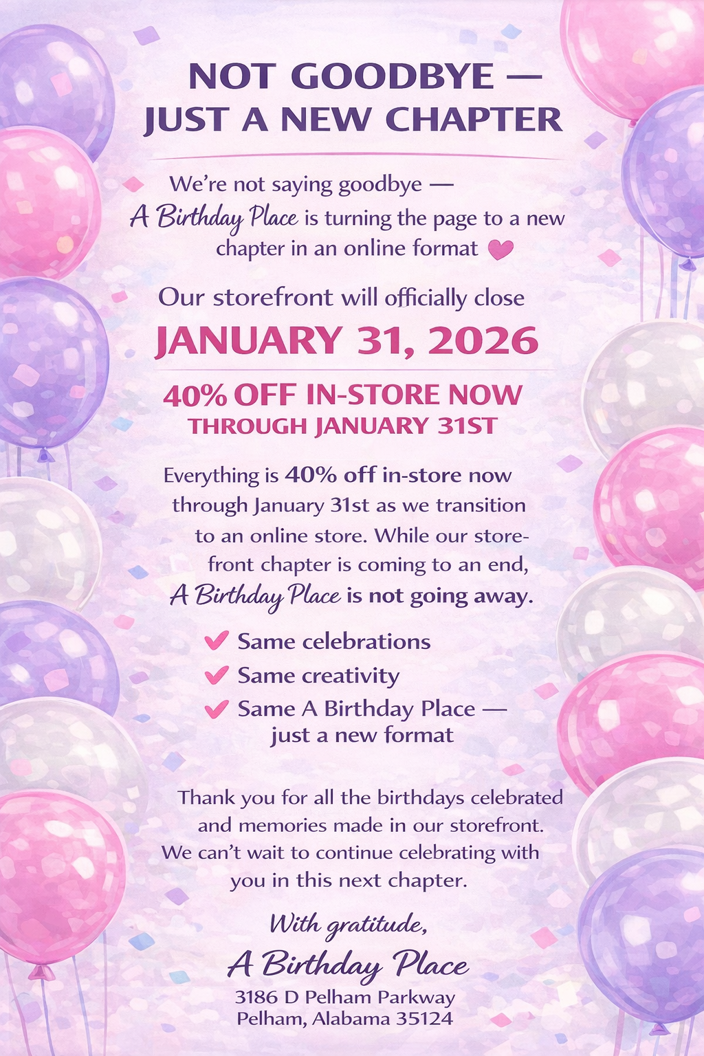 A Birthday Place is your go-to destination for everything you need to celebrate life’s special moments. From themed party supplies and personalized decorations to edible cake toppers and DIY baking tools, we provide high-quality products to make birthdays, holidays, weddings, and events unforgettable. Whether you’re planning a party at home or hosting in our versatile event space in Pelham, Alabama, we offer creative solutions, fast shipping, and custom design services to help you celebrate in style.
