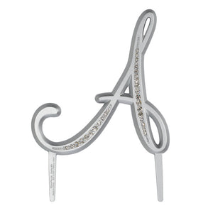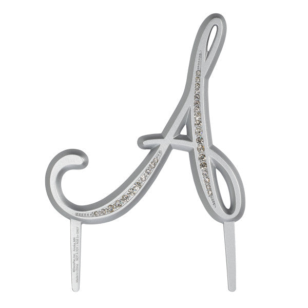 Monograms have a silver finish and shiny, clear rhinestone accents. Each features picks at the bottom for easy insertion into cakes. Available in large and small sizes. Height does not include pick.