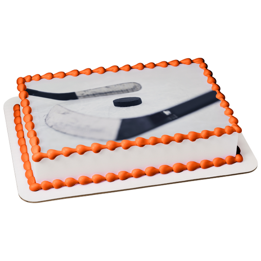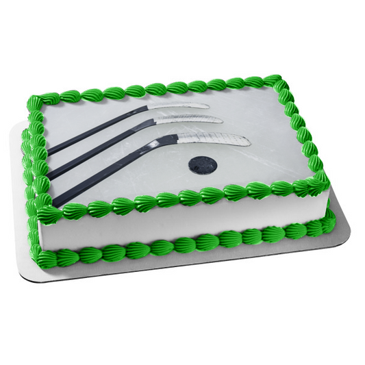 Hockey Stick and Puck on Ice Edible Cake Topper Image ABPID55505