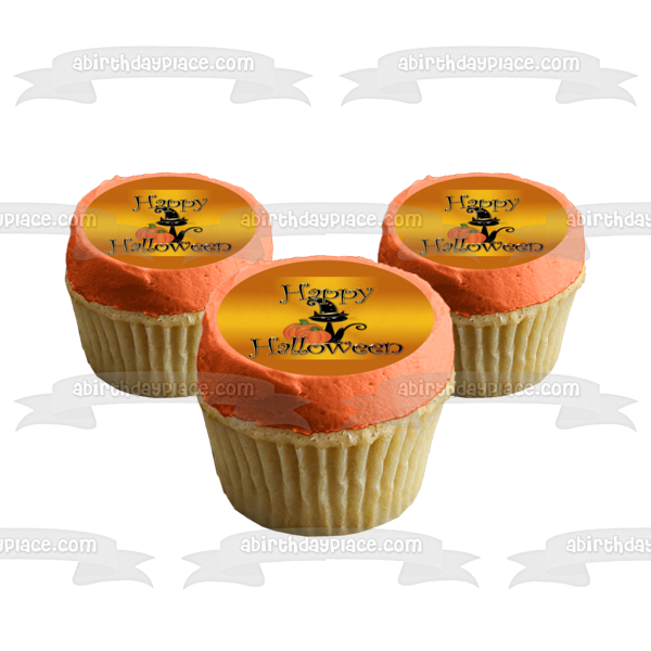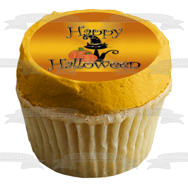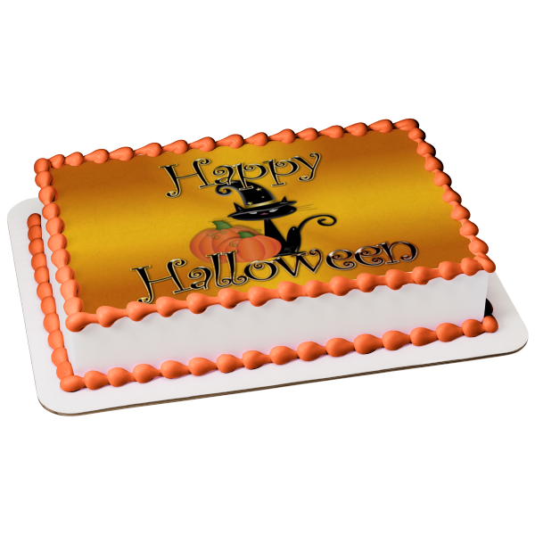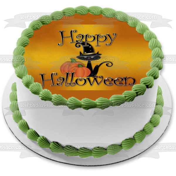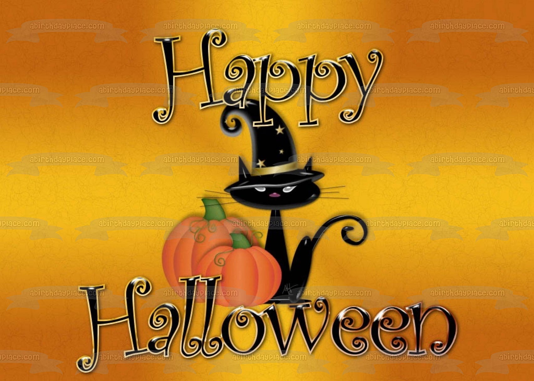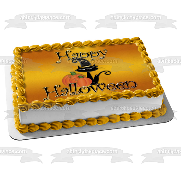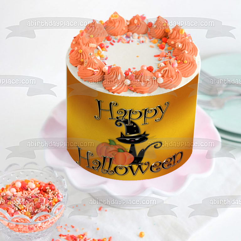 Celebrate your special day with this Happy Halloween themed Edible Cake Topper Image featuring Pumpkins and a Black Cat wearing a Witch Hat!
