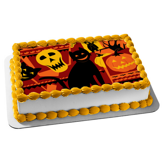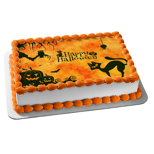 Scary Happy Halloween Black Cat Owl Ghosts Pumpkins Bats Jack-O-Lantern Edible Cake Topper Image ABPID50333