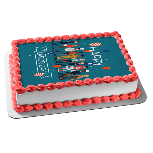 Decorate your Cake with this Happy Labor Day themed Edible Cake Topper Image featuring Workers and Balloons!