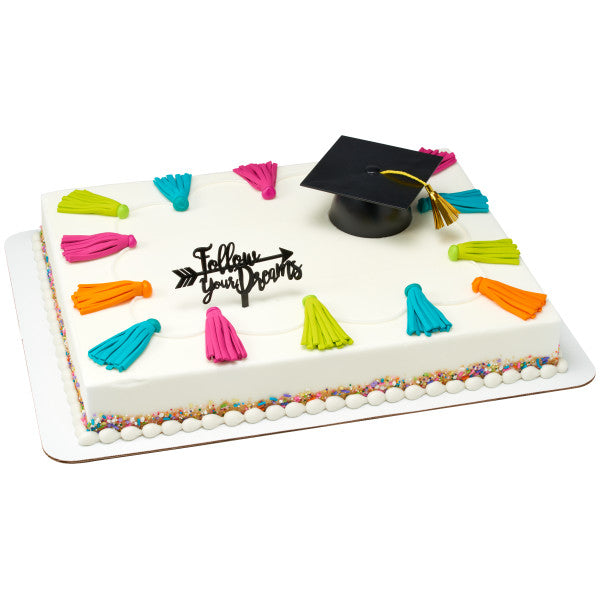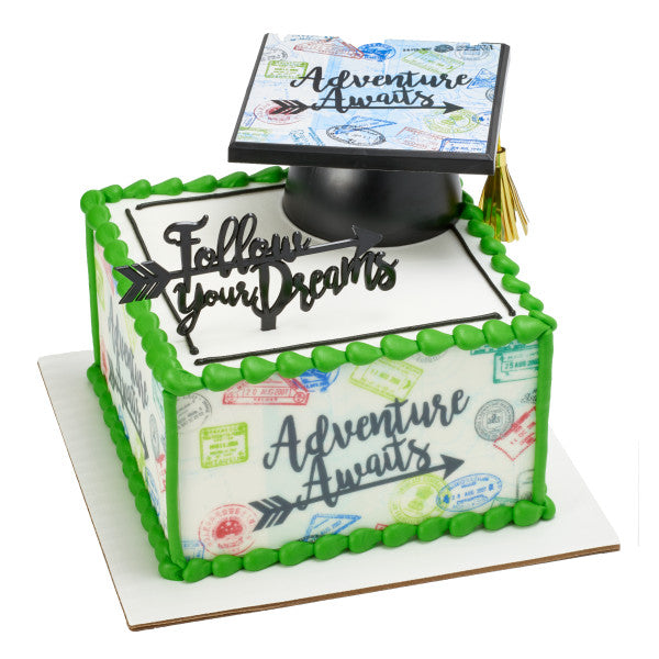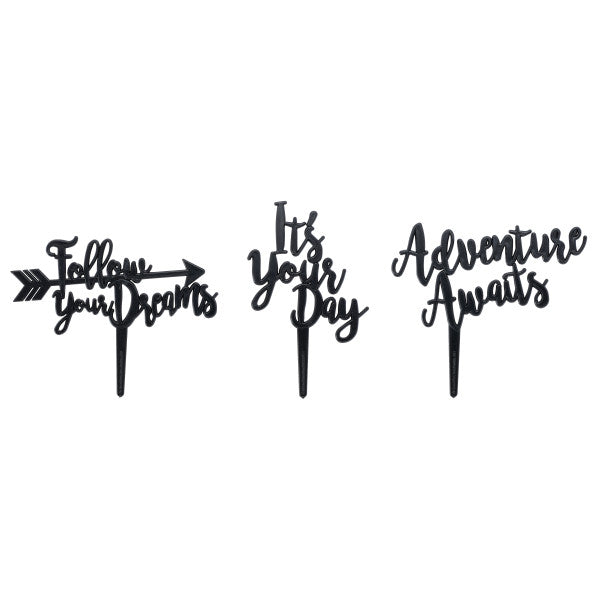 Whether you're planning a retirement party or a Graduations celebration, make their day special with these toppers. Follow Your Dreams, It's Your Day, Adventure Awaits - are all the various sayings waiting to finish your look in this assortment. Made with food safe plastic.