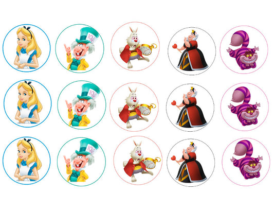 Alicia en el país de las maravillas, el sombrerero loco, el conejo blanco, la reina de corazones y el gato de Chesire, imágenes comestibles para cupcakes ABPID06740