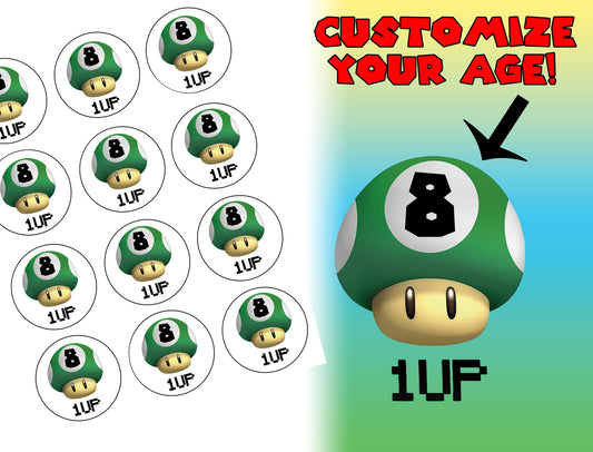 1up Mushroom Mario Fiesta de cumpleaños Edad personalizable Imágenes comestibles para cupcakes ABPID50798