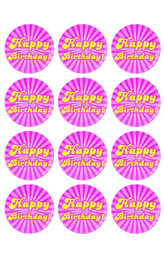 Imágenes comestibles para decoración de cupcakes con fondos de remolino rosa de feliz cumpleaños con temática de los años 70