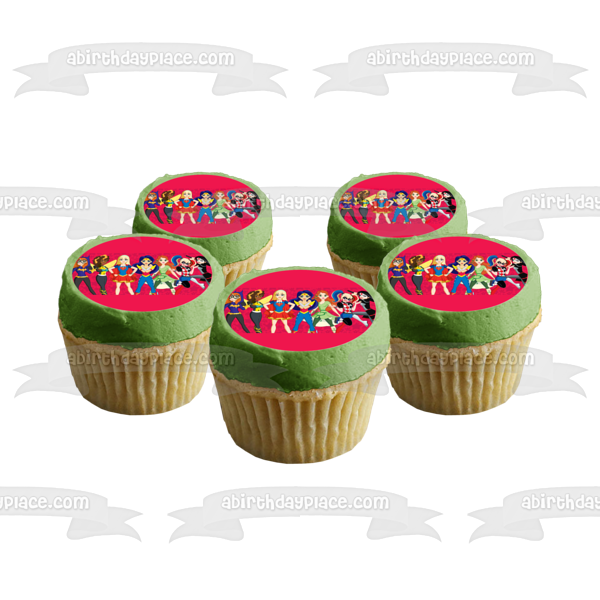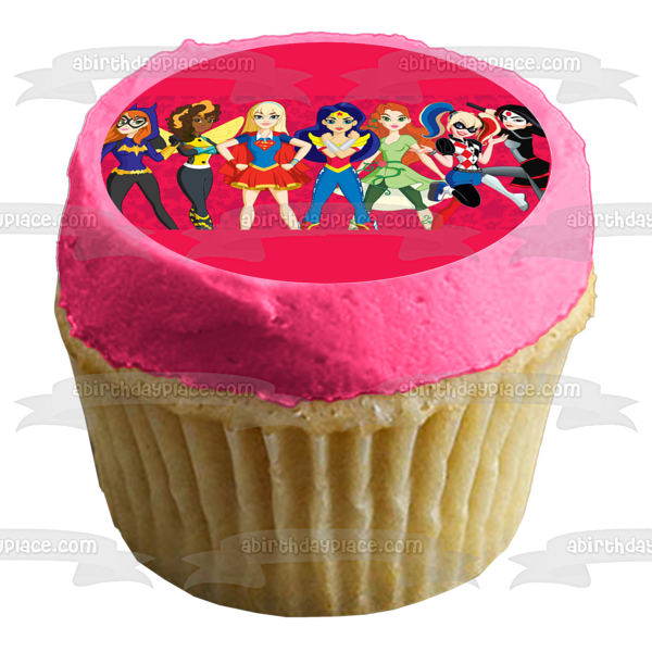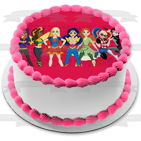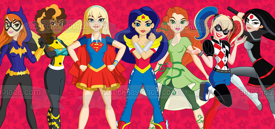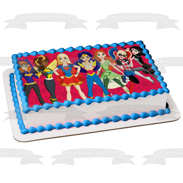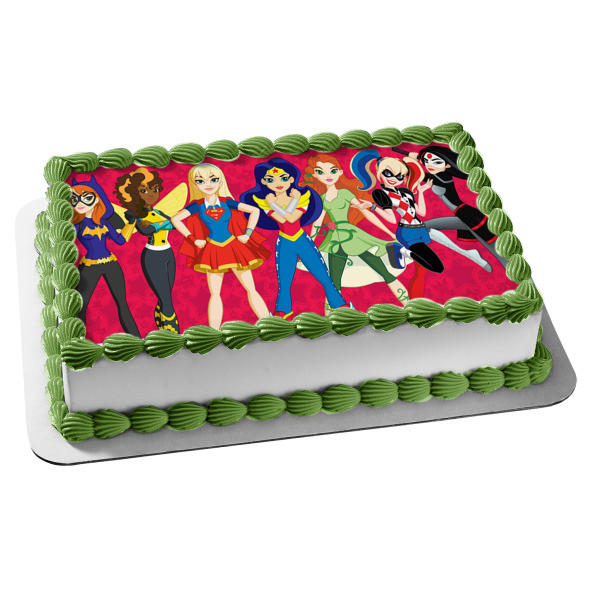 ¡Celebra tu día con esta imagen de adorno comestible para pastel con temática de Super Hero Girls que presenta algunos de tus superhéroes favoritos como Batwoman, Supergirl y Harley Quinn!