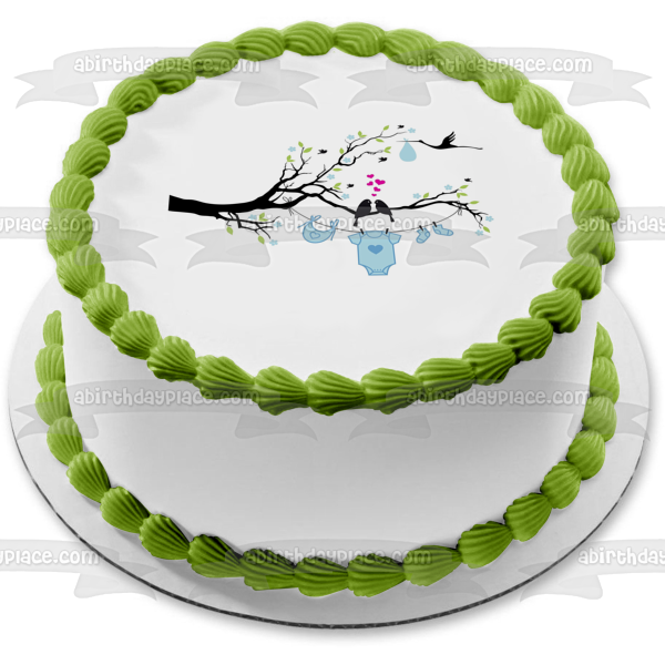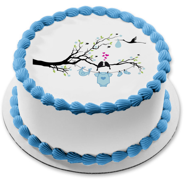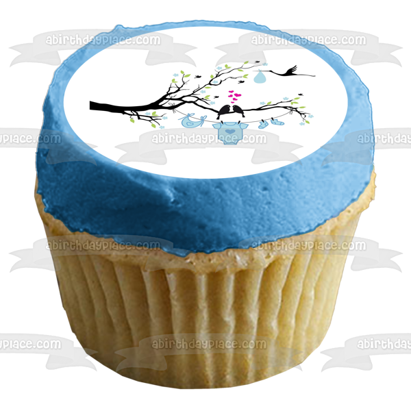 ¡Celebra tu Baby Shower para un niño con esta imagen de adorno comestible para pastel que presenta una cigüeña, un babero, un mono y calcetines para bebé!