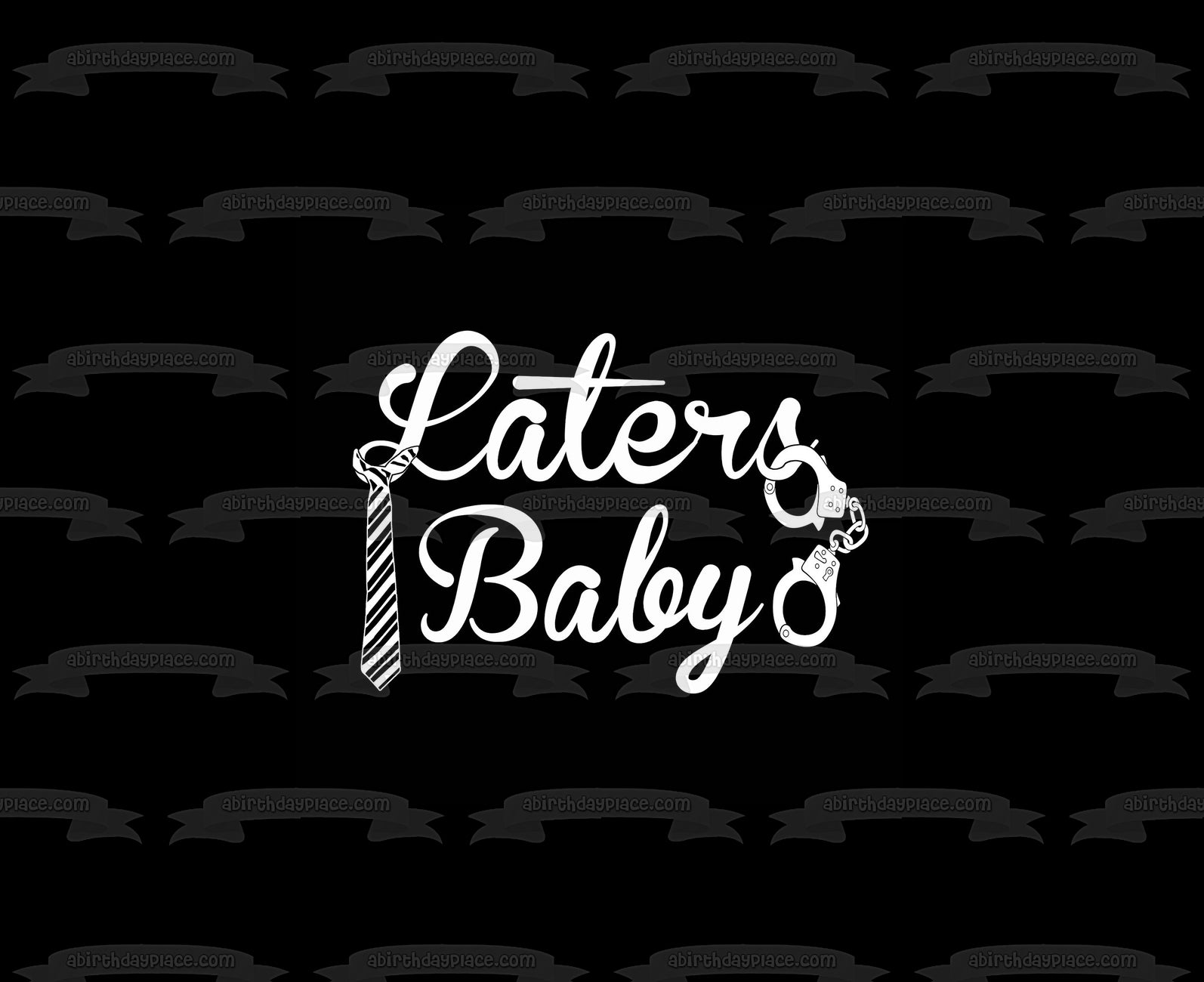 ¡Celebra tu día especial con esta imagen de adorno comestible para pastel con temática de Cincuenta sombras de Grey que presenta las palabras "Laters Baby" con corbata y esposas!