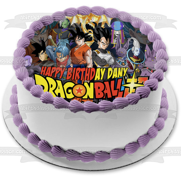 ¡Celebra tu día con esta imagen de adorno comestible para pastel con temática de Dragon Ball Super que presenta a Goku, Broly y Cheelai!