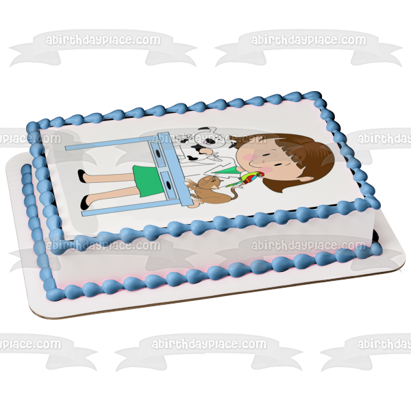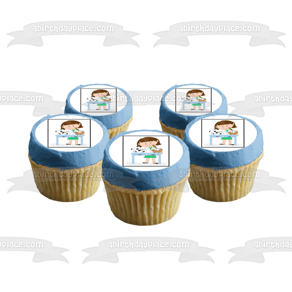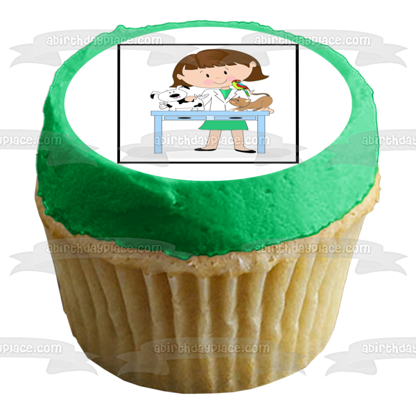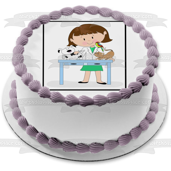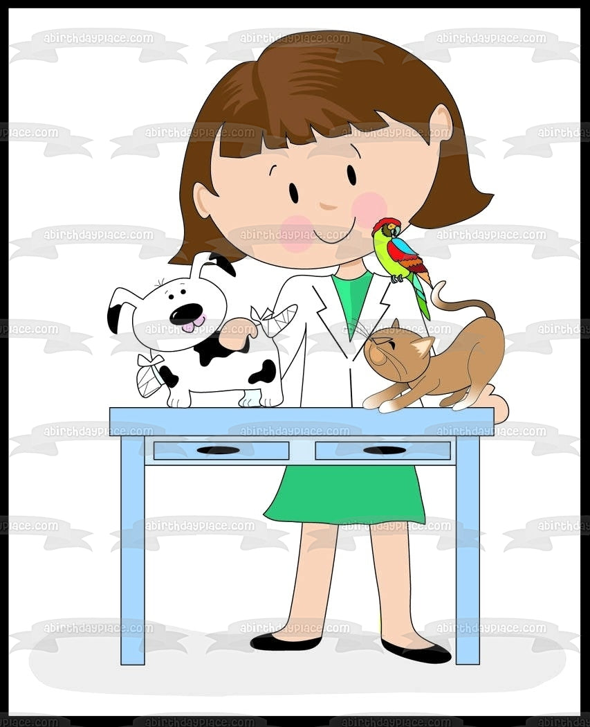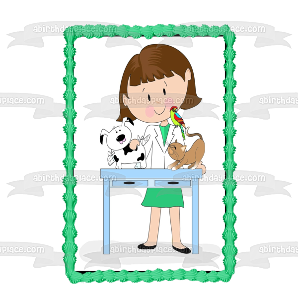 ¡Celebra tu día especial con esta imagen de adorno comestible para pastel con temática veterinaria que presenta un perro, un gato y un pájaro!