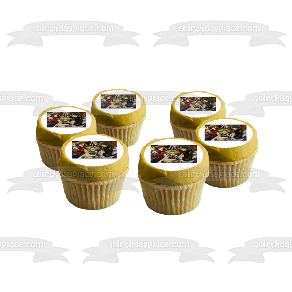 ¡Celebra tu día especial con esta imagen de adorno comestible para pastel con temática de Yu Gi Oh que presenta a Yugi Mutou y Jaden Yuki!