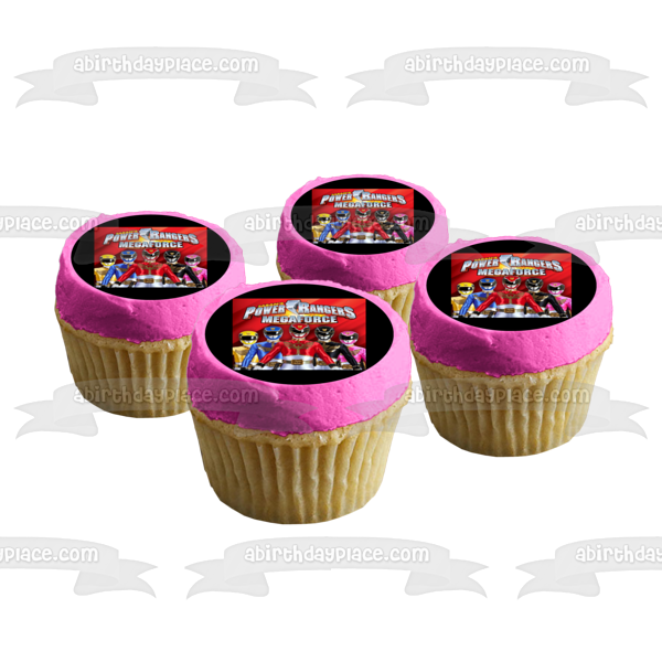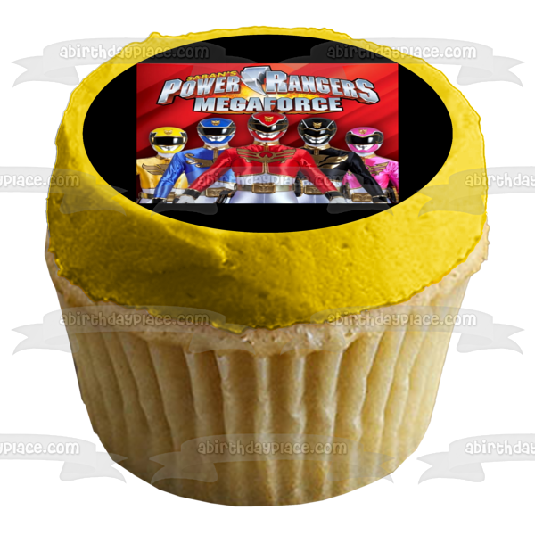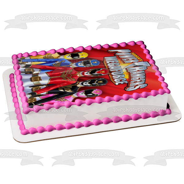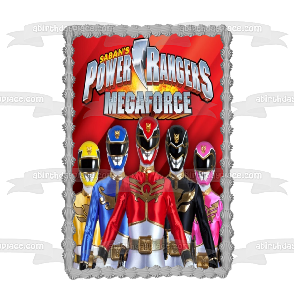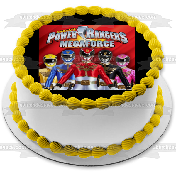 ¡Celebra tu día especial con esta imagen de adorno comestible para pastel con temática de Power Rangers que presenta el logotipo de Power Rangers Megaforce de Saban encima de los Rangers rojo, azul, negro, amarillo y rosa!