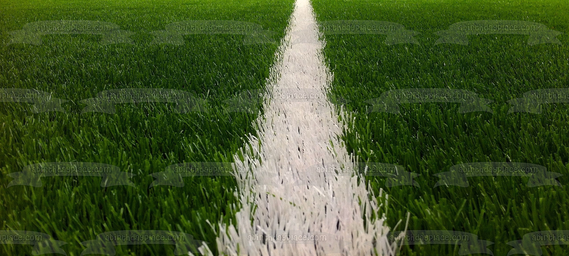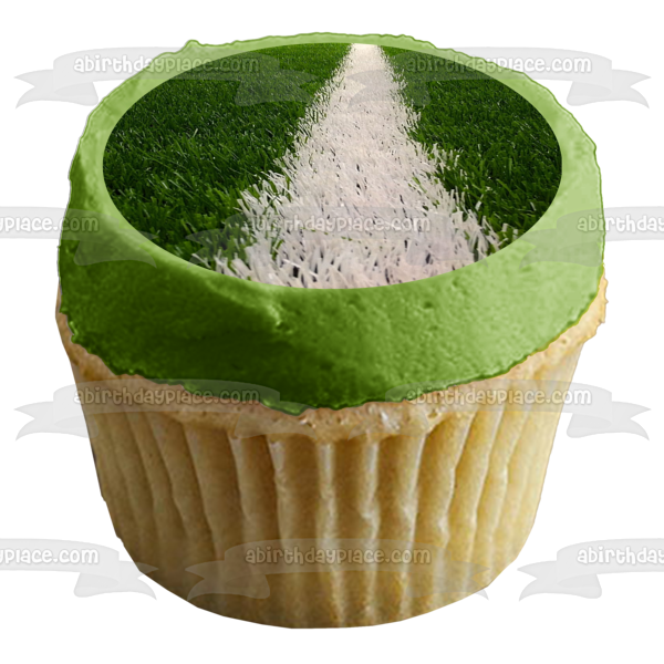 ¡Celebra a tu fanático del fútbol con esta imagen de adorno comestible para pastel que presenta una línea blanca pintada en el césped!