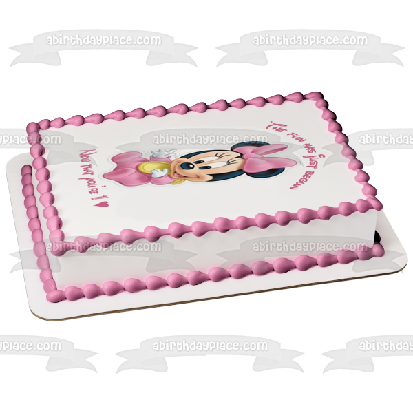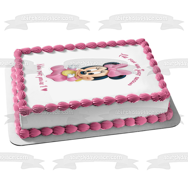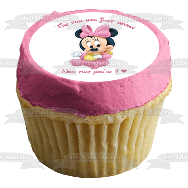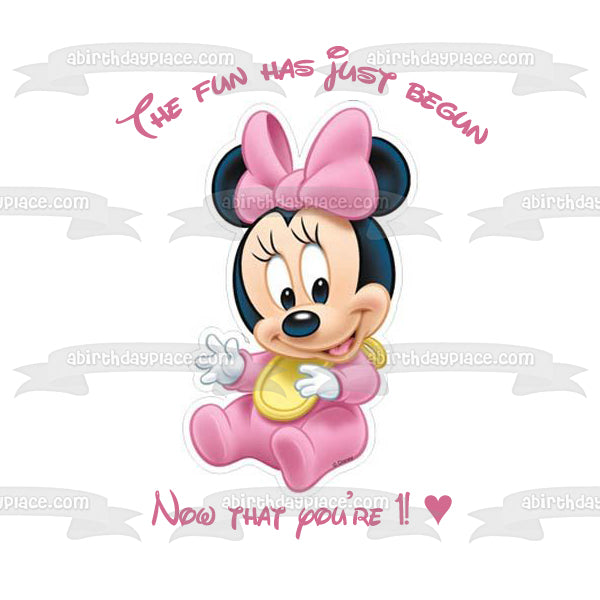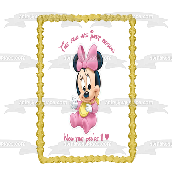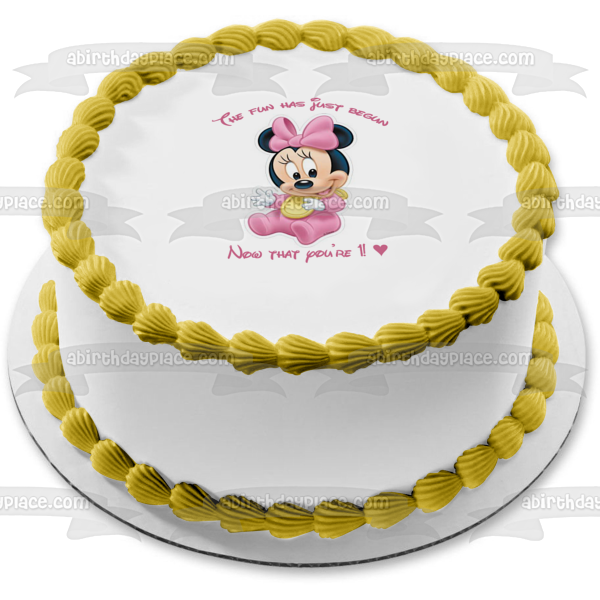 ¡Decora tu pastel con esta imagen de adorno comestible para pastel con temática de Baby Minnie Mouse que muestra el feliz primer cumpleaños!