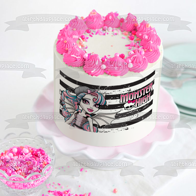 ¡Celebra a tu fan de Monster High con esta imagen de adorno comestible para pastel que presenta a Rochelle y un fondo de rayas blancas y negras!