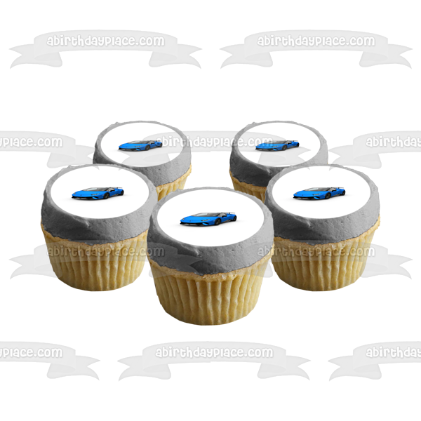 ¡Celebra a tu fanático de los autos deportivos con esta imagen de adorno comestible para pastel con temática de Lamborghini azul y fondo blanco!