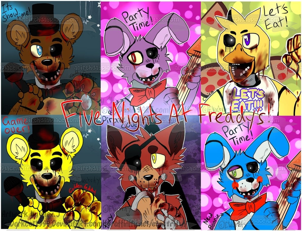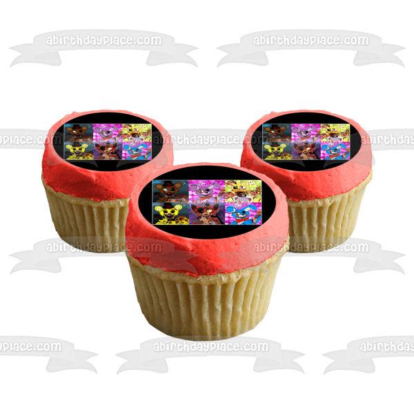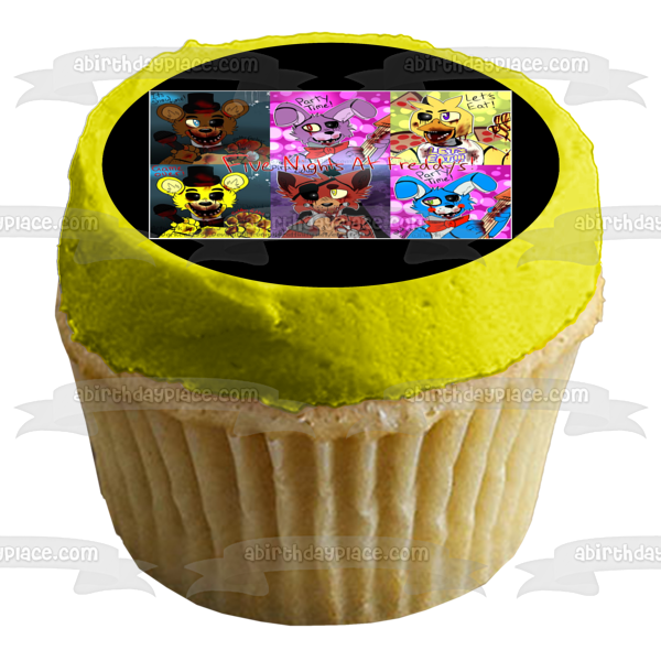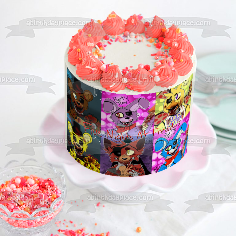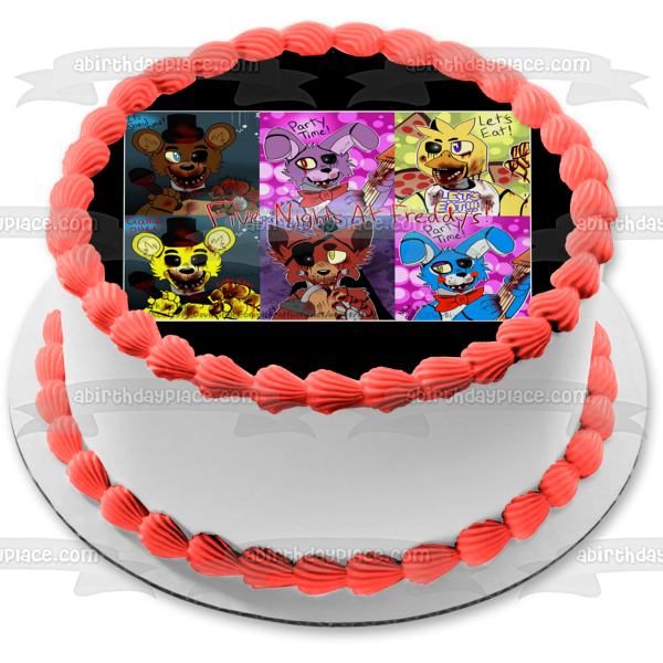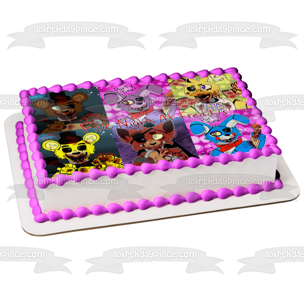 ¡Celebra tu fanático de Five Nights at Freddy's con esta imagen de adorno comestible para pastel con Fazbear, Bonnie, Foxy, Golden Freddy y Chico the Duck!