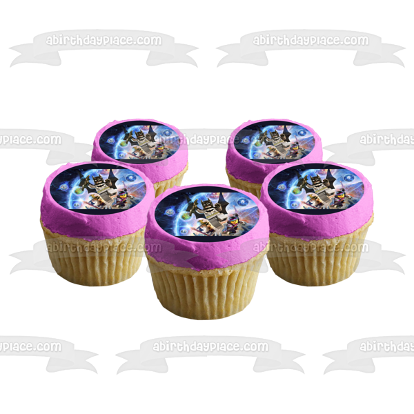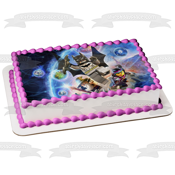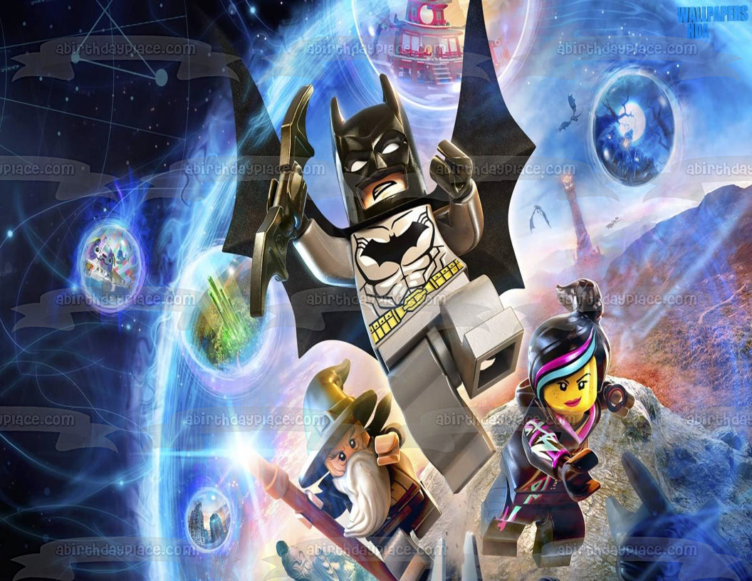 ¡Decora tu pastel con esta imagen de adorno comestible para pastel con temática de la película LEGO que presenta a Batman, Wyldstyle y Vitruvius Flying!
