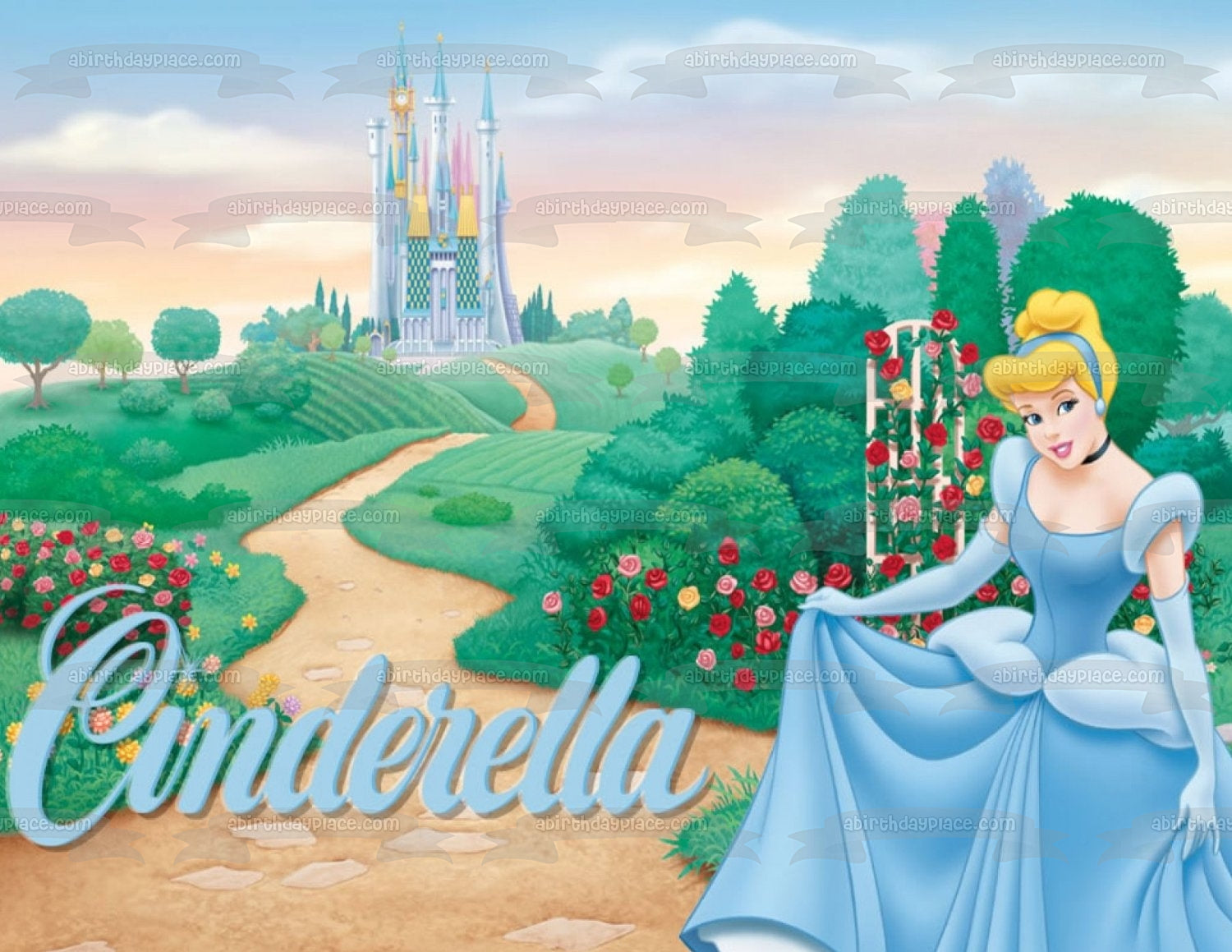 Imagen comestible para tarta con diseño de princesa Cenicienta, vestido de baile, castillo, flores, ABPID07576