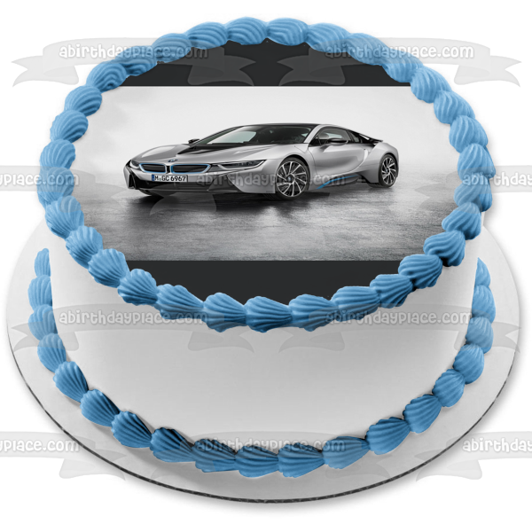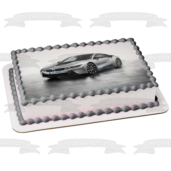 ¡Decora tu pastel con esta imagen de adorno comestible para pastel con temática de autos deportivos que presenta un auto BMW i8 plateado 2015!