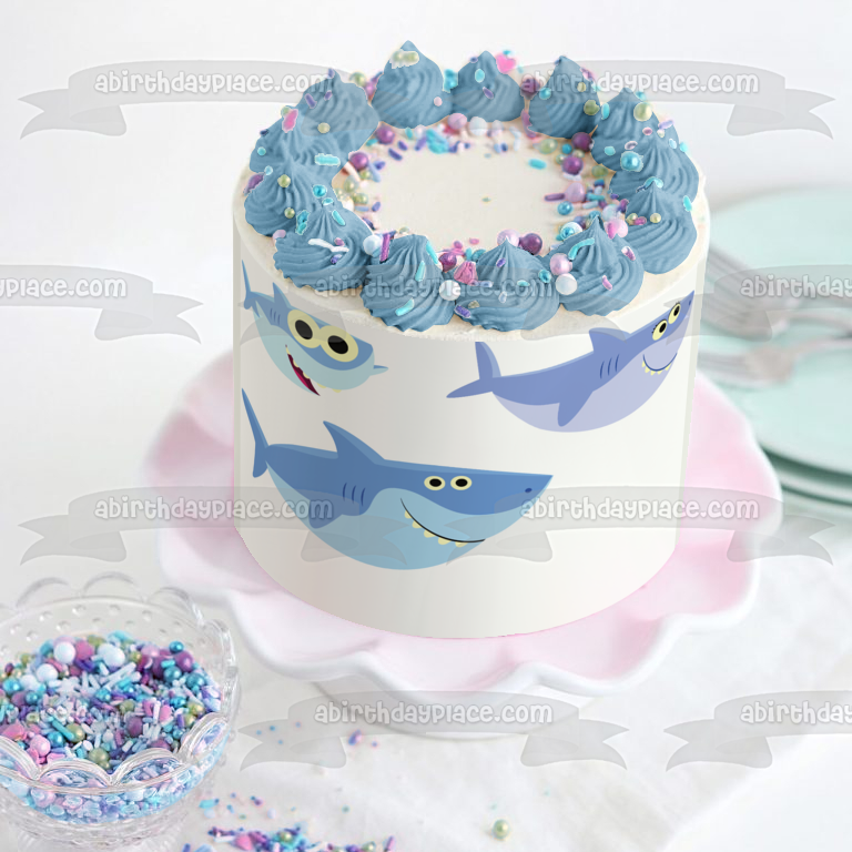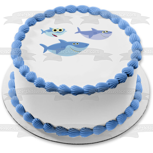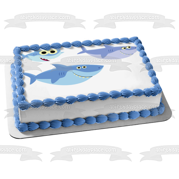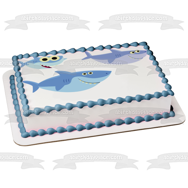 ¡Celebra tu día especial con esta imagen de adorno comestible para pastel con temática de dibujos animados de la familia de tiburones que presenta a mamá, papá y tiburón bebé!
