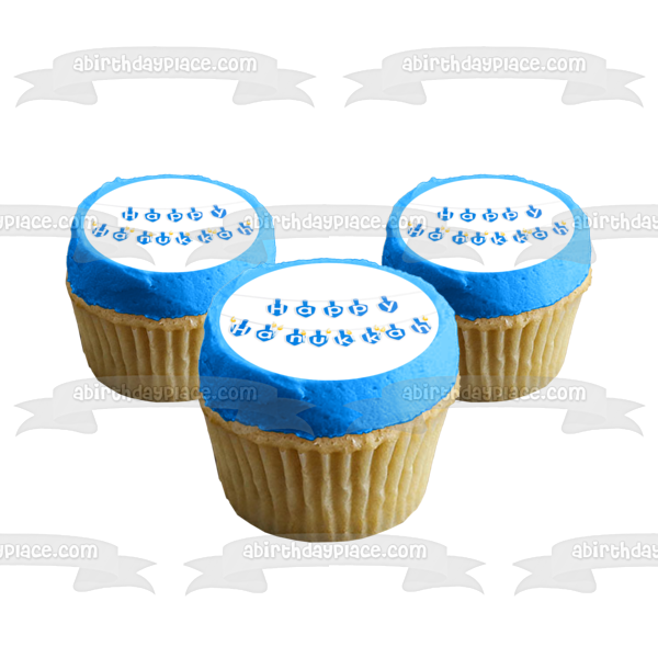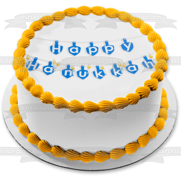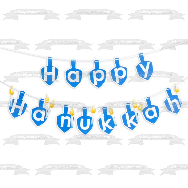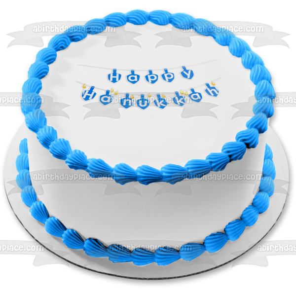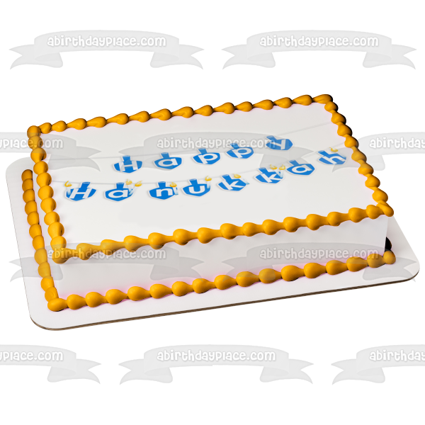 ¡Decora tu pastel con esta imagen de adorno comestible para pastel con temática de Happy Hanukkah que presenta una pancarta azul!