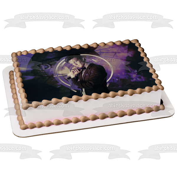 Decora tu pastel con esta imagen de adorno comestible para pastel con temática de Doctor Who que presenta al Doctor y la palabra "Desconectado" sobre un fondo morado y negro.