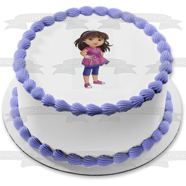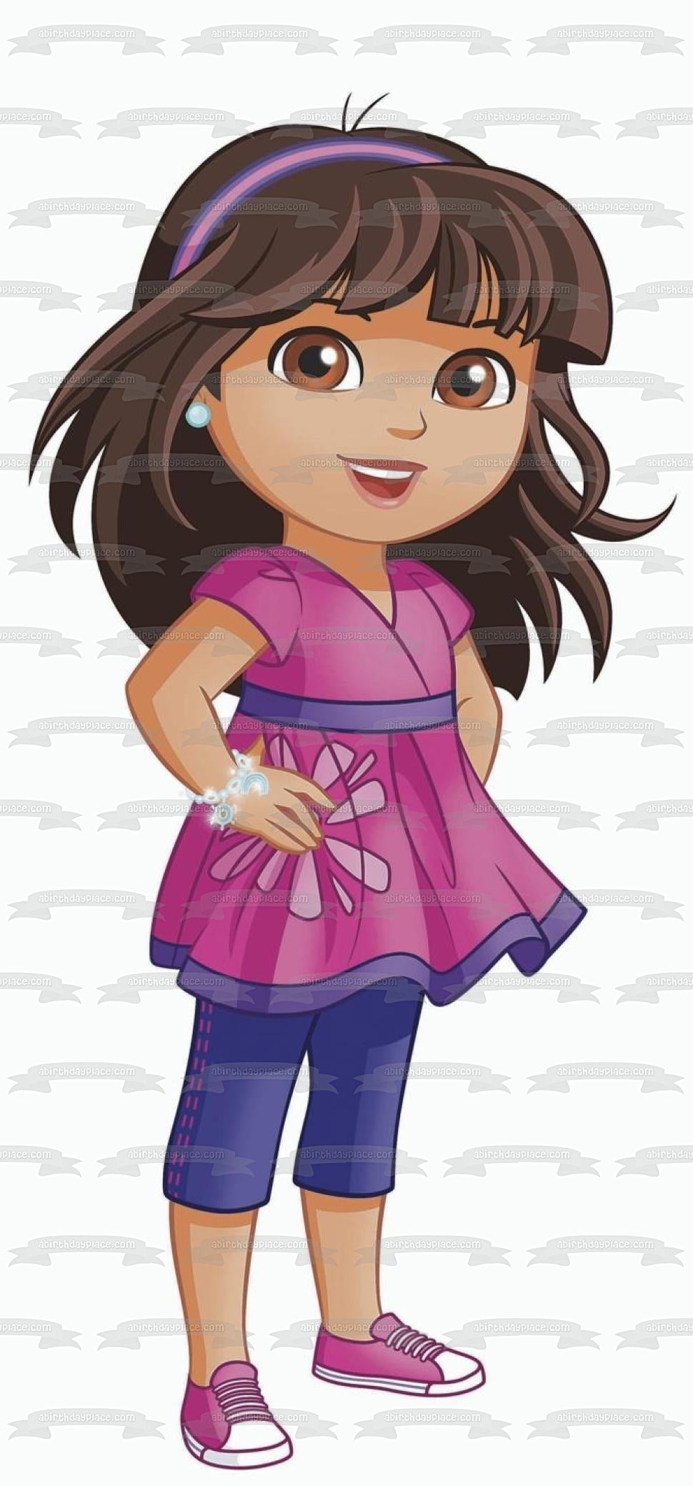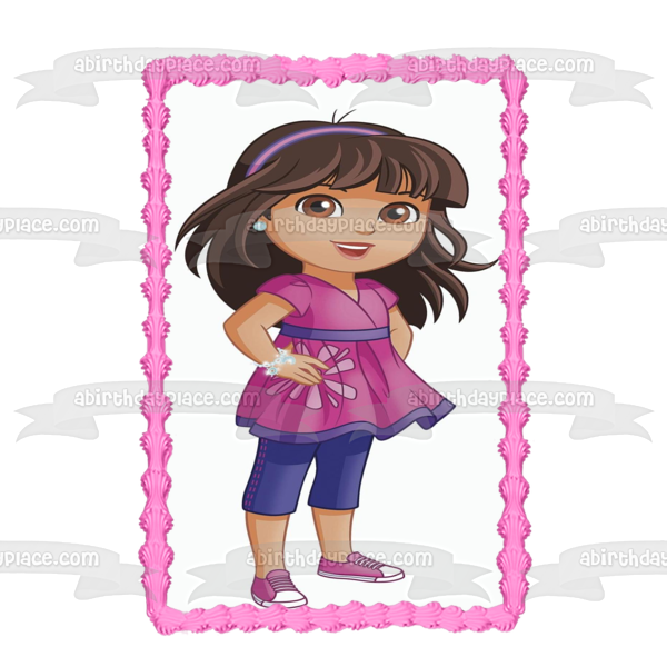 ¡Decora tu pastel con esta imagen de adorno comestible para pastel con temática de Dora y sus amigos que muestra a Dora usando joyas brillantes!