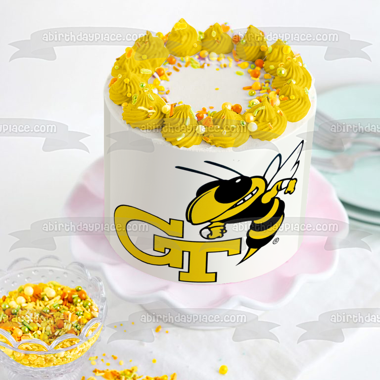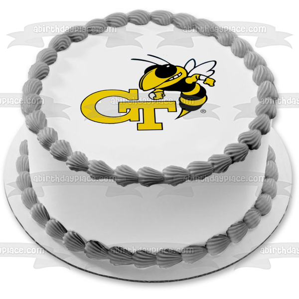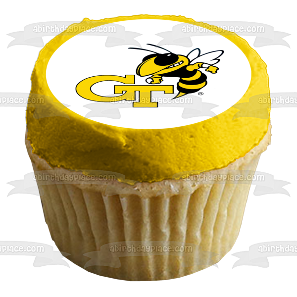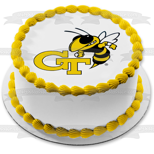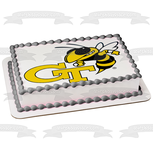 ¡Decora tu pastel con esta genial imagen de adorno comestible para pastel con temática de Georgia Tech que presenta su logotipo con un abejorro!