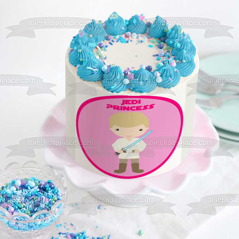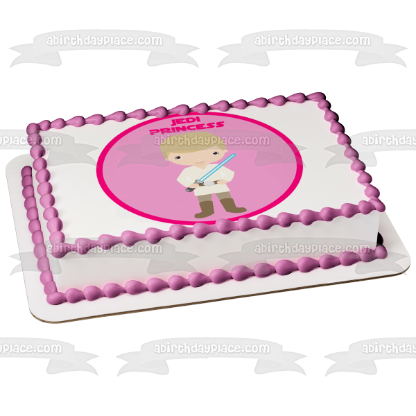 ¡Decora tu pastel con esta imagen de adorno comestible para pastel con temática de Star Wars que presenta un dibujo animado de Anakin Skywalker, una princesa Jedi y un fondo rosa!