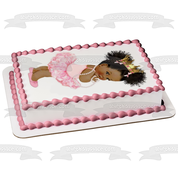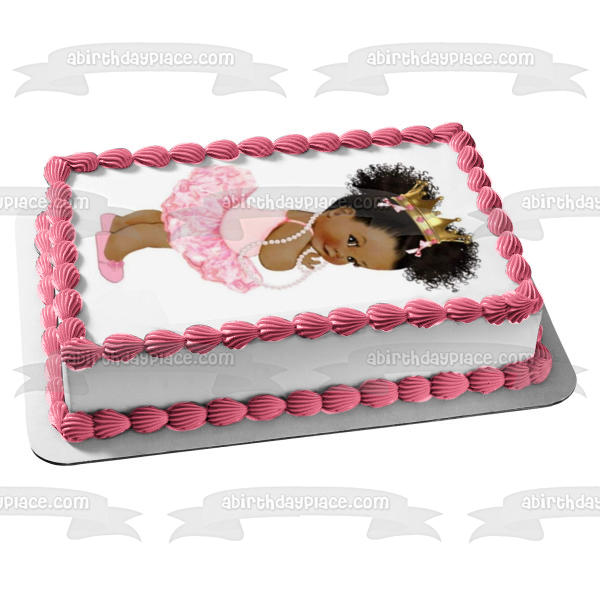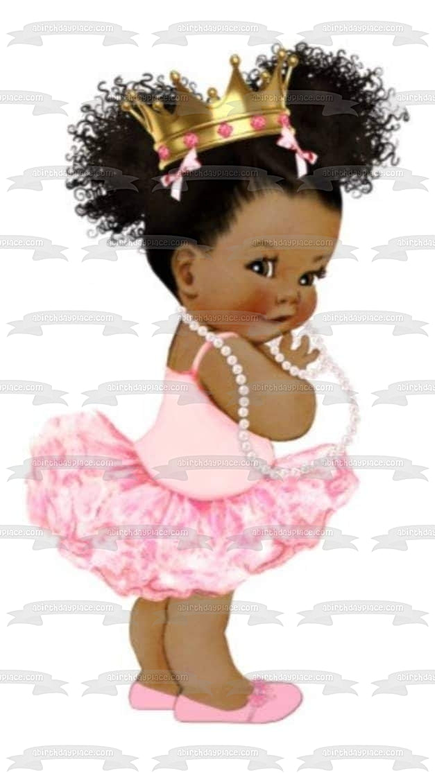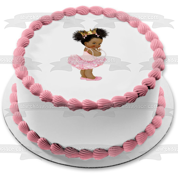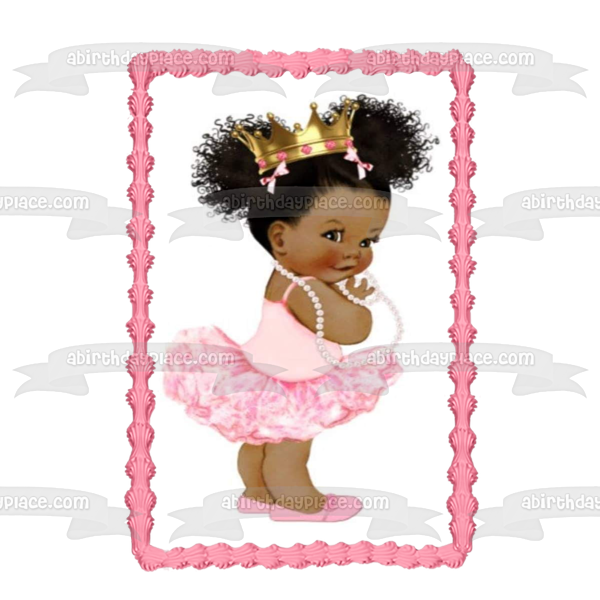 ¡Decora tu pastel con esta imagen de adorno comestible para pastel con temática de Baby Shower que presenta a una niña afroamericana con un vestido de bailarina rosa y zapatos con una corona dorada!