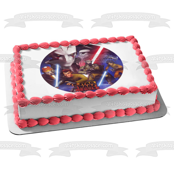 ¡Decora tu pastel con esta imagen de adorno comestible para pastel con temática de Star Wars Rebels que presenta a Ezra Bridger, el Gran Inquisidor, Kanan Jarrus y Storm Troopers!