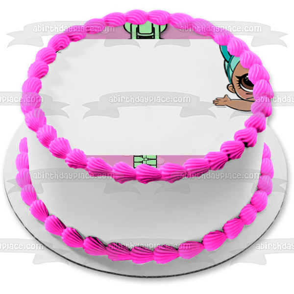 ¡Decora tu pastel con esta imagen de adorno comestible para pastel con temática de LOL Surprise que presenta a Troublemaker y un borde de lunares morados!