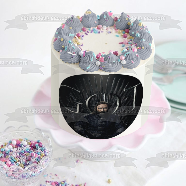 ¡Decora tu pastel con esta imagen de adorno comestible para pastel con temática de Juego de Tronos que muestra a Sandor Clegane sentado en el Trono de Hierro y un fondo negro!
