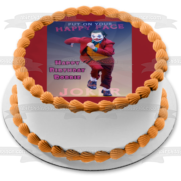 Joker 2019 Arthur Fleck Feliz cumpleaños Nombre personalizado "Pon tu cara feliz" Joaquin Phoenix Edible Cake Topper Imagen ABPID50316