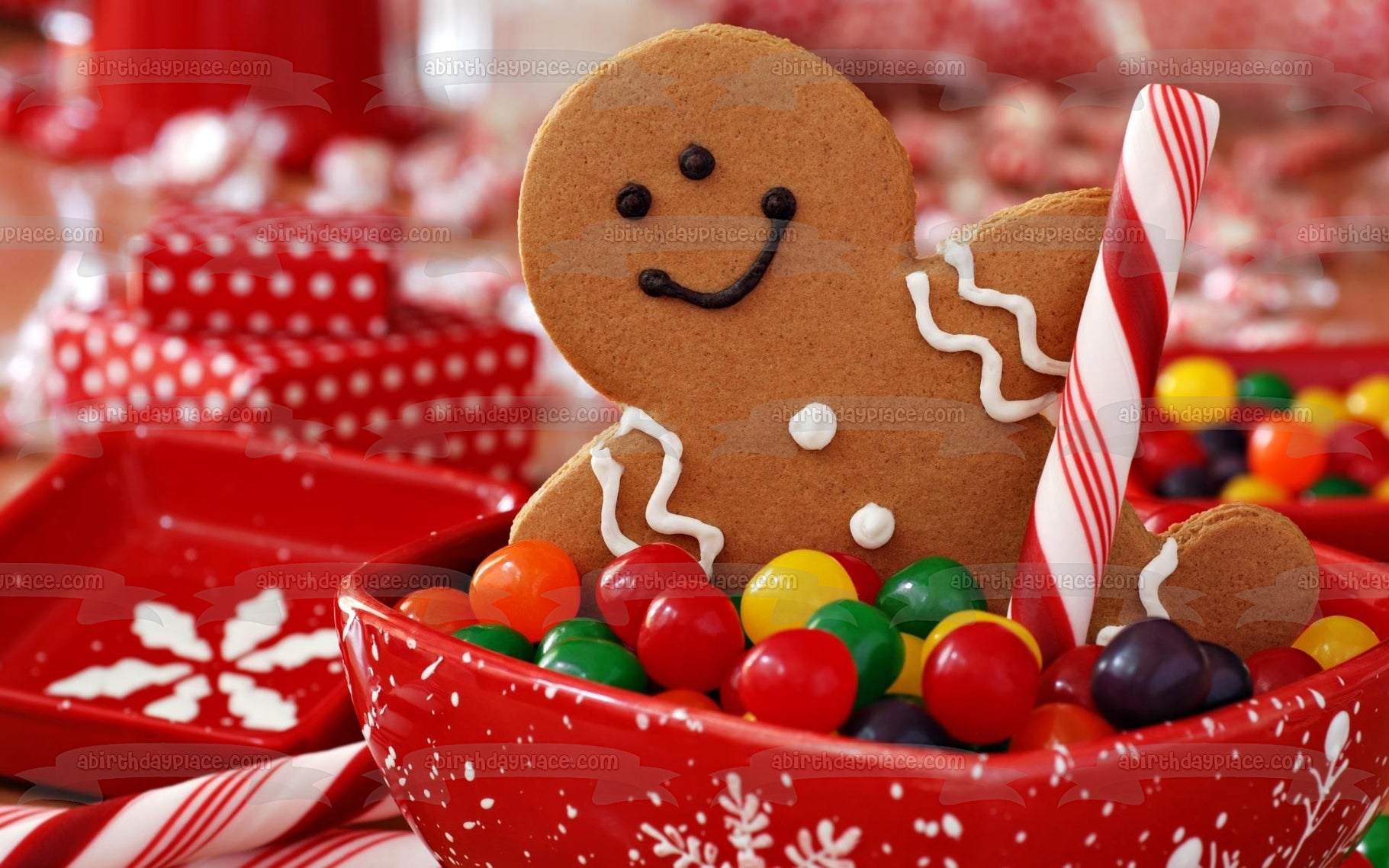 Adorno comestible para tarta con diseño de hombre de jengibre navideño, galleta, gominolas, cuenco, caramelo, imagen ABPID50600