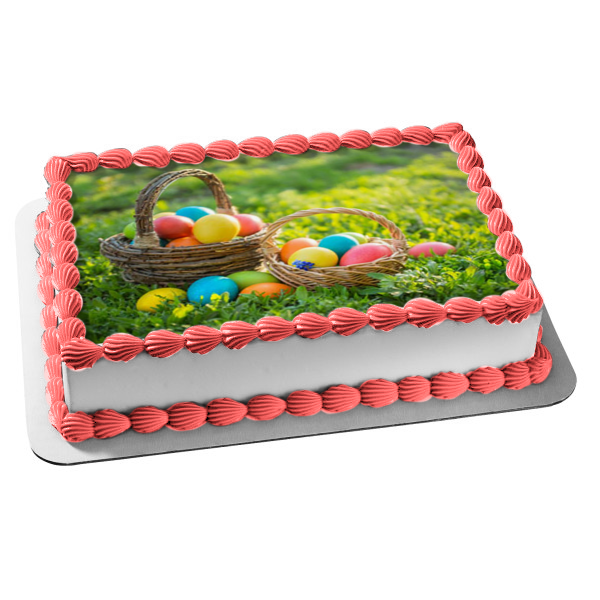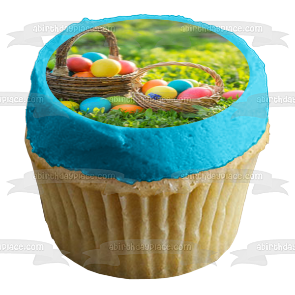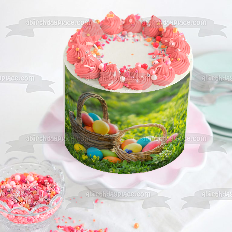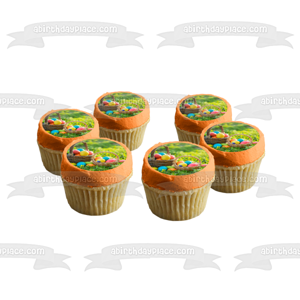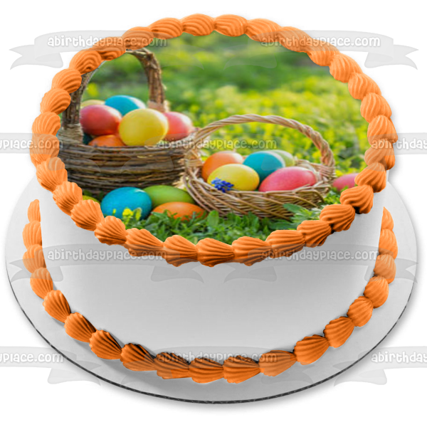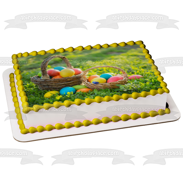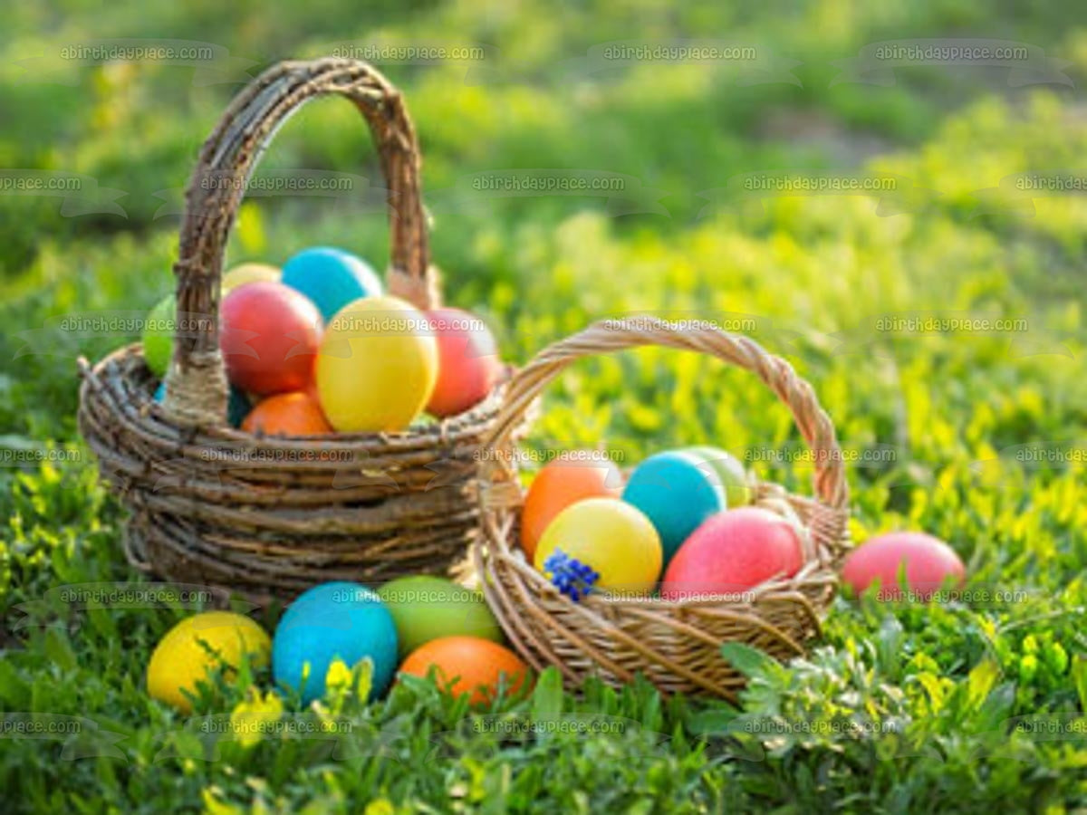 ¡Decora tu pastel con esta imagen de adorno comestible para pastel con temática de Feliz Pascua que presenta huevos de Pascua y cestas con un fondo de hierba!