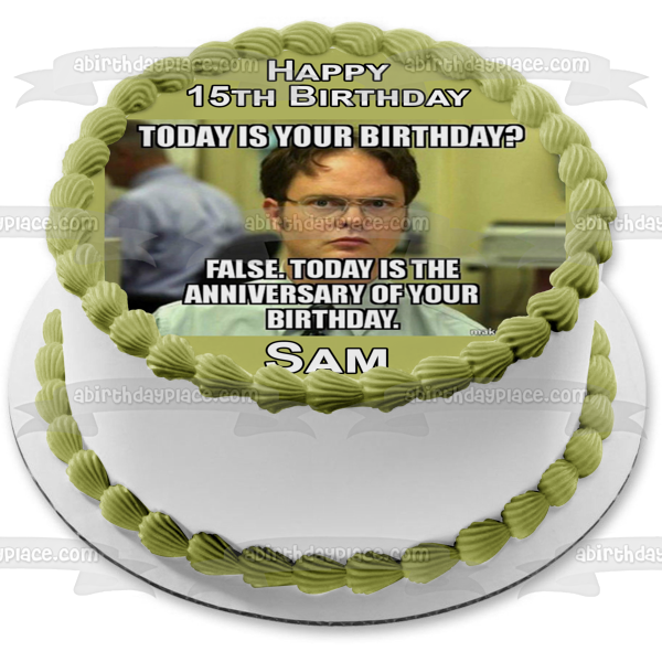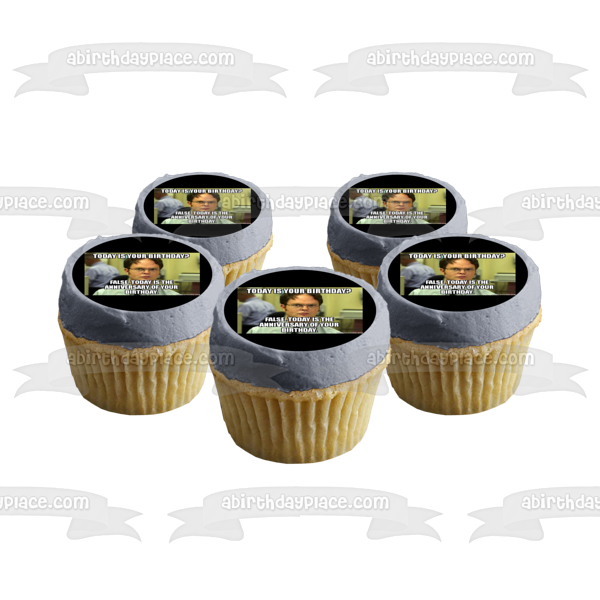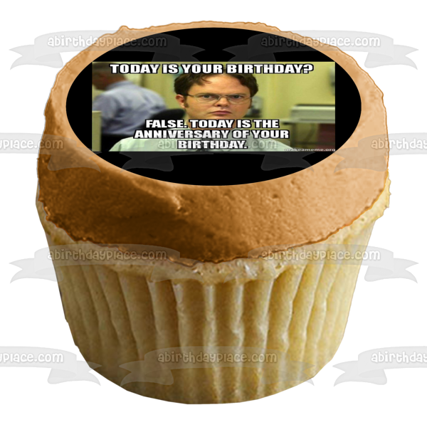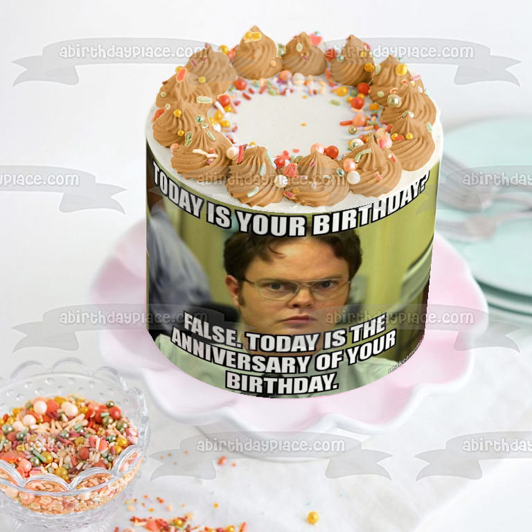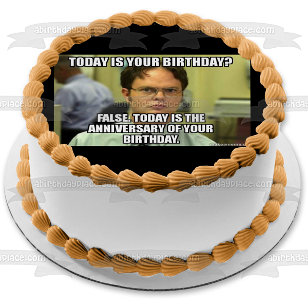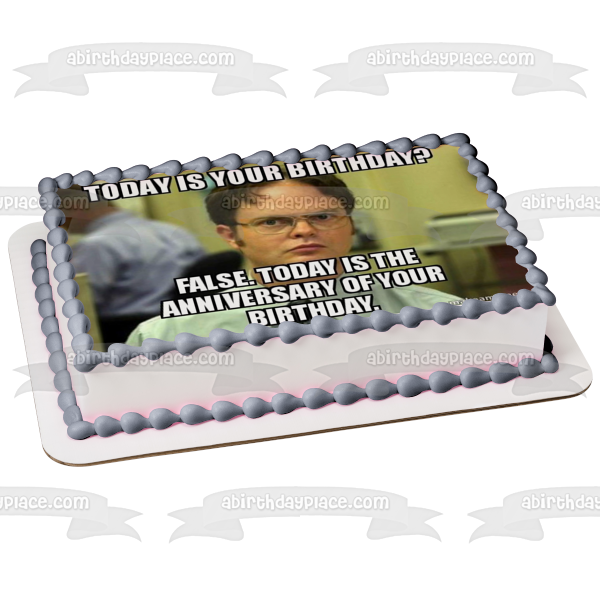 Decora tu pastel con esta imagen de adorno comestible para pastel con el tema The Office Happy Birthday Meme que presenta a Dwight Schrute y las palabras "¿Hoy es tu cumpleaños?... ¡Falso, hoy es el aniversario de tu cumpleaños"!
