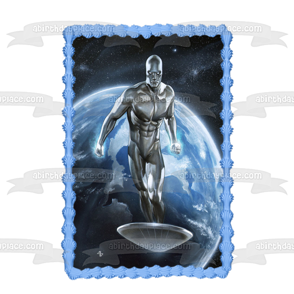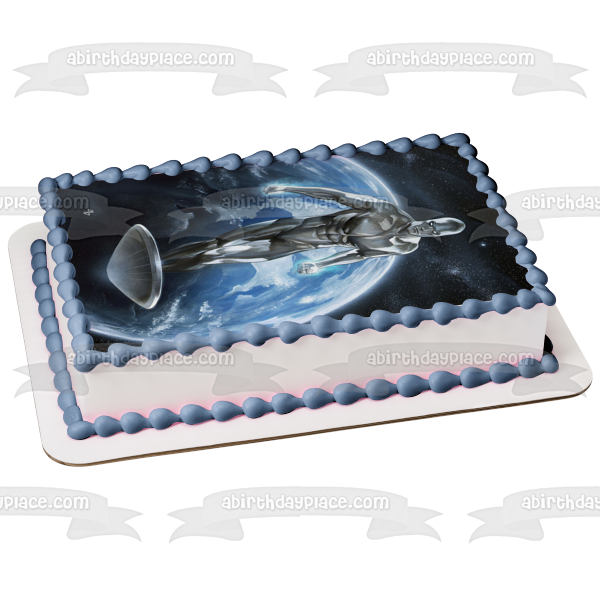 ¡Decora tu pastel con esta imagen de adorno comestible para pastel con temática de Los Cuatro Fantásticos: Rise of the Silver Surfer que presenta a Silver Surfer!