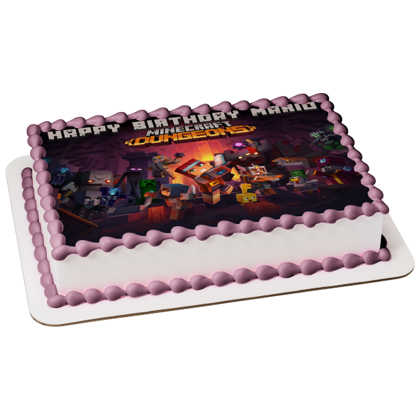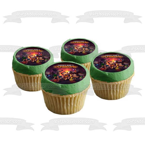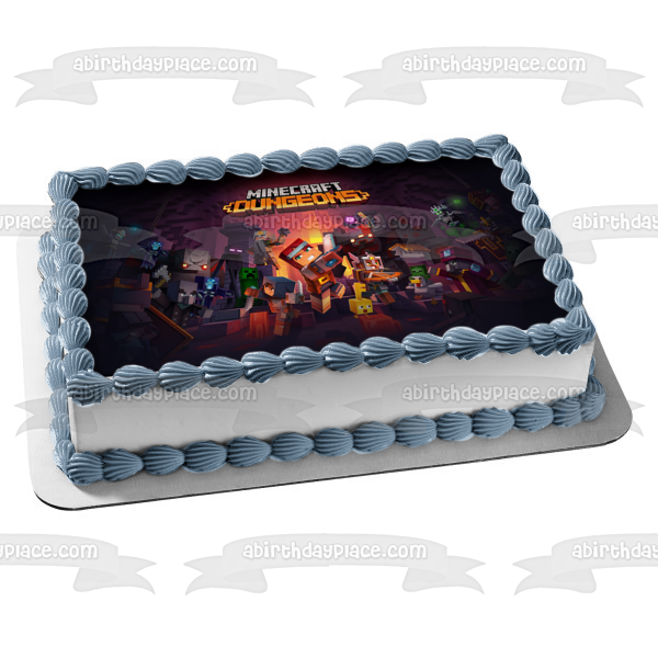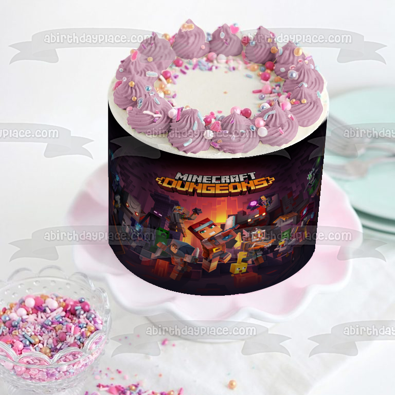 ¡Decora tu pastel con esta imagen de adorno comestible para pastel con temática de Minecraft Dungeons que presenta un mago, un guerrero, un arquero y un creeper!