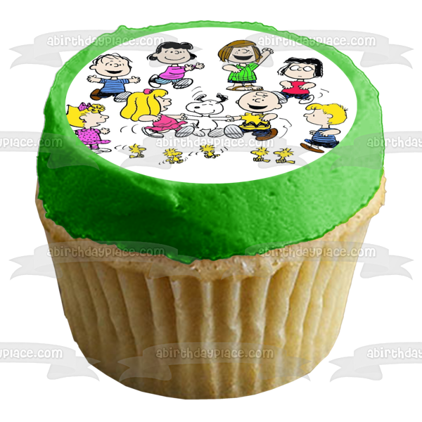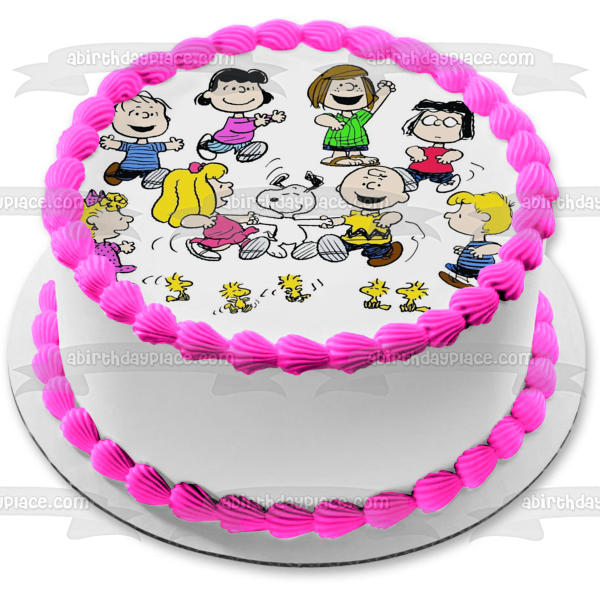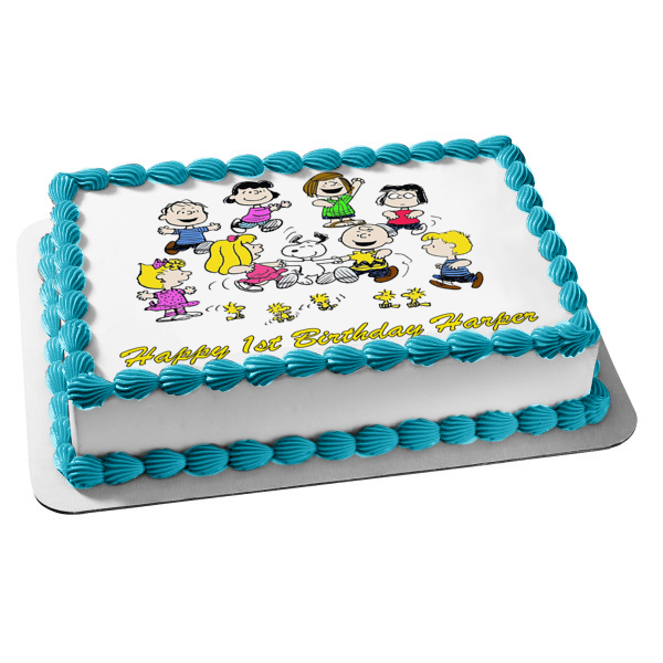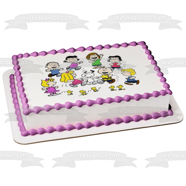 ¡Decora tu pastel con esta imagen de adorno comestible para pastel con temática de Peanuts que incluye a Charlie Brown, Snoopy, Linus, Lucy, Sally, Peppermint Patty y Woodstock!