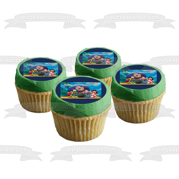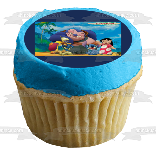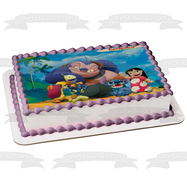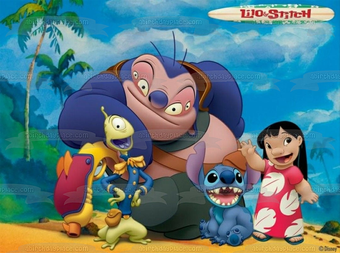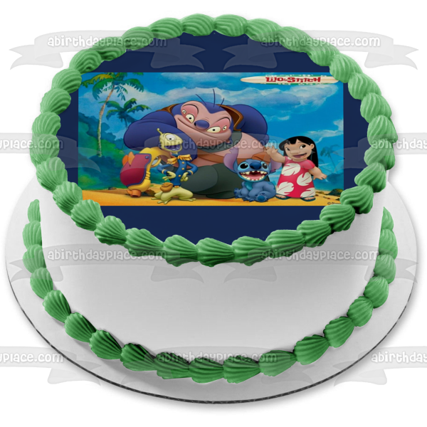¡Decora tu pastel con esta imagen de adorno comestible para pastel con temática de Lilo y Stitch que presenta a Jumba Jookiba y Pleakley!