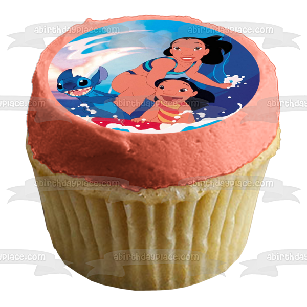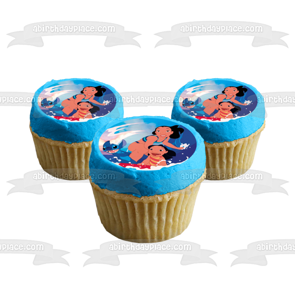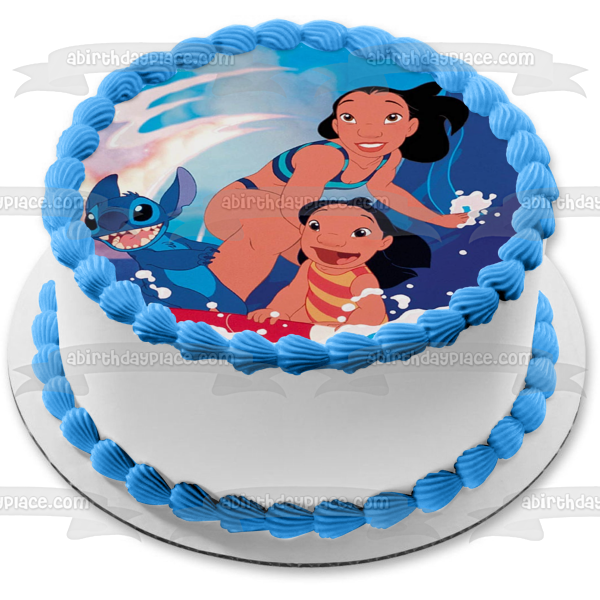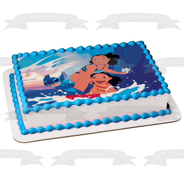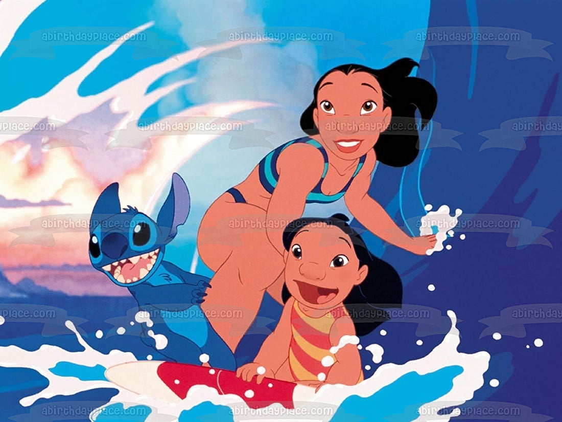 ¡Celebra tu fiesta con este adorno comestible para pastel de Lilo y Stitch de Disney que presenta a Lilo, Stitch y Nani surfeando las olas en Hawái!