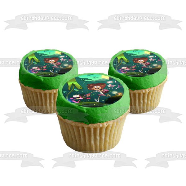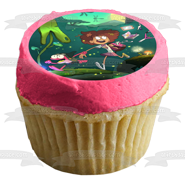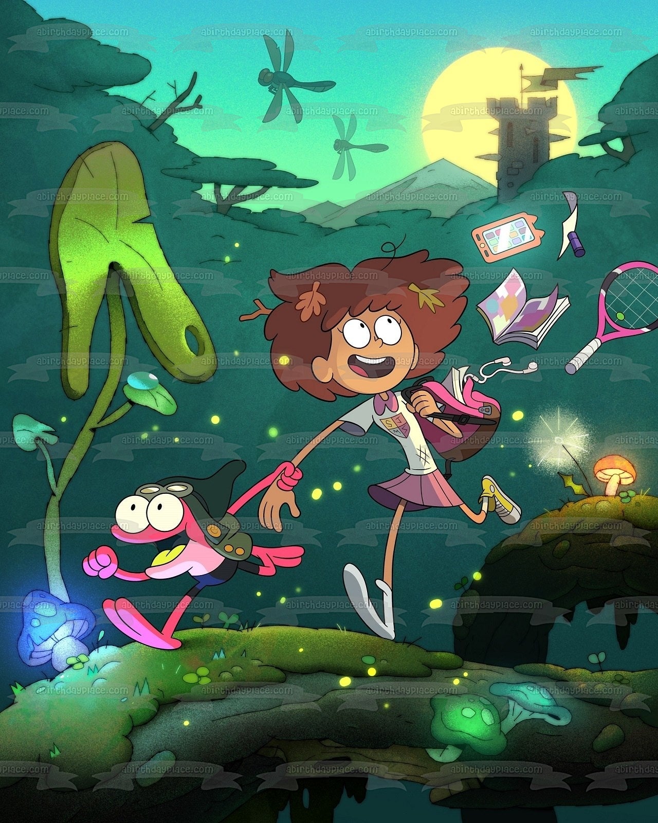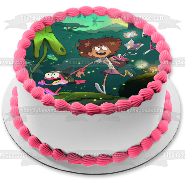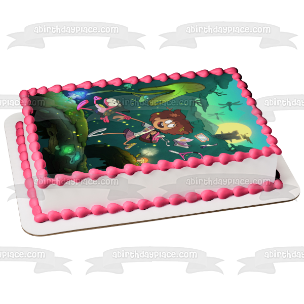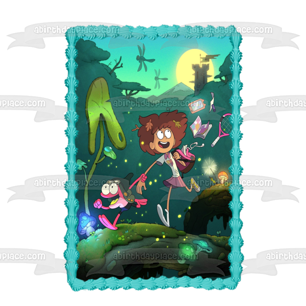 ¡Decora tu pastel con esta imagen de adorno comestible para pastel con temática de anfibios que presenta a Anne y Sprig Plantar Running!