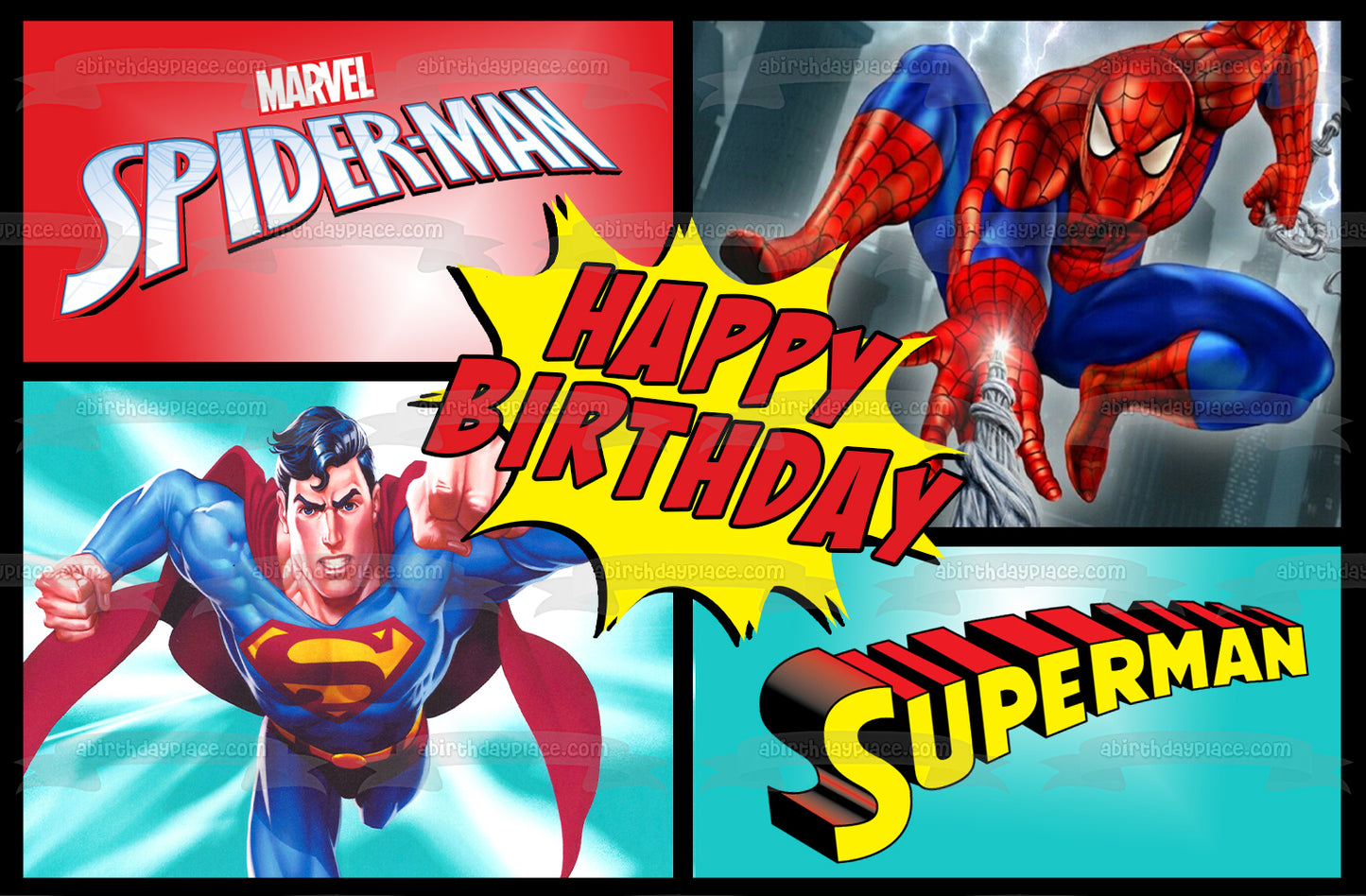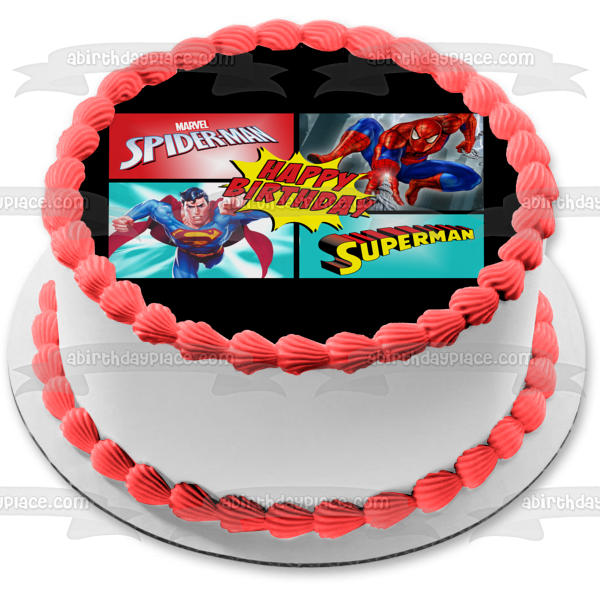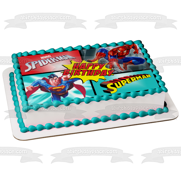 ¡Decora tu pastel con esta imagen de adorno comestible para pastel con temática de feliz cumpleaños de Marvel Comics y DC Comics con Superman y Spider-Man!