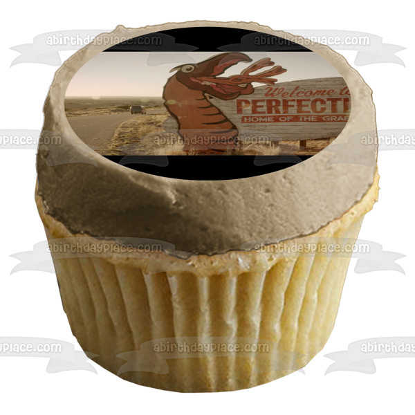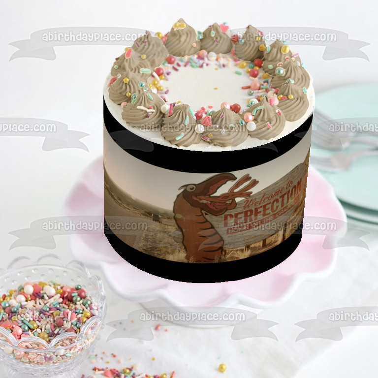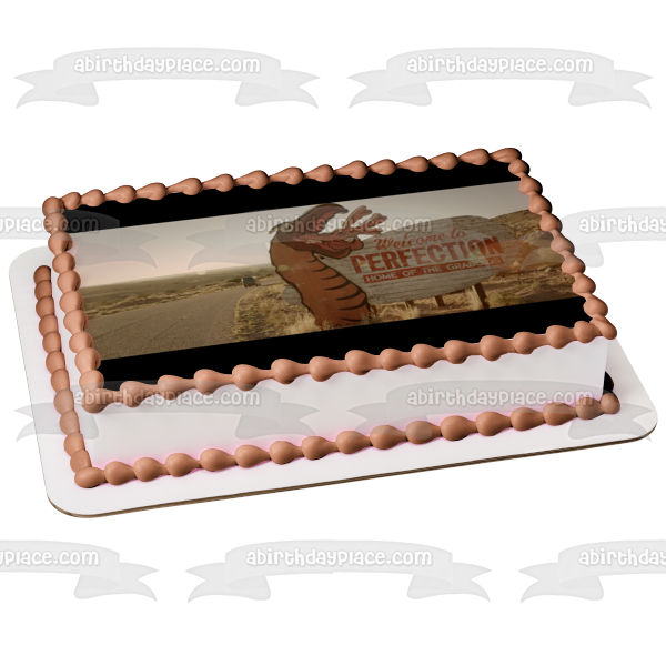 ¡Decora tu pastel con esta imagen de adorno comestible para pastel Tremors que presenta el cartel de bienvenida Perfection!