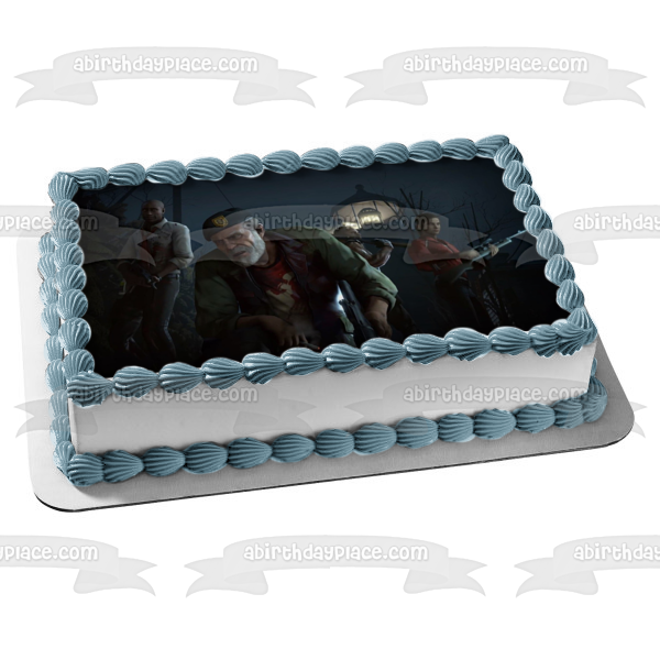 ¡Decora tu pastel con esta imagen de adorno comestible para pastel con temática de Left 4 Dead 2 que presenta a Bill, el entrenador, Ellis y Francis!