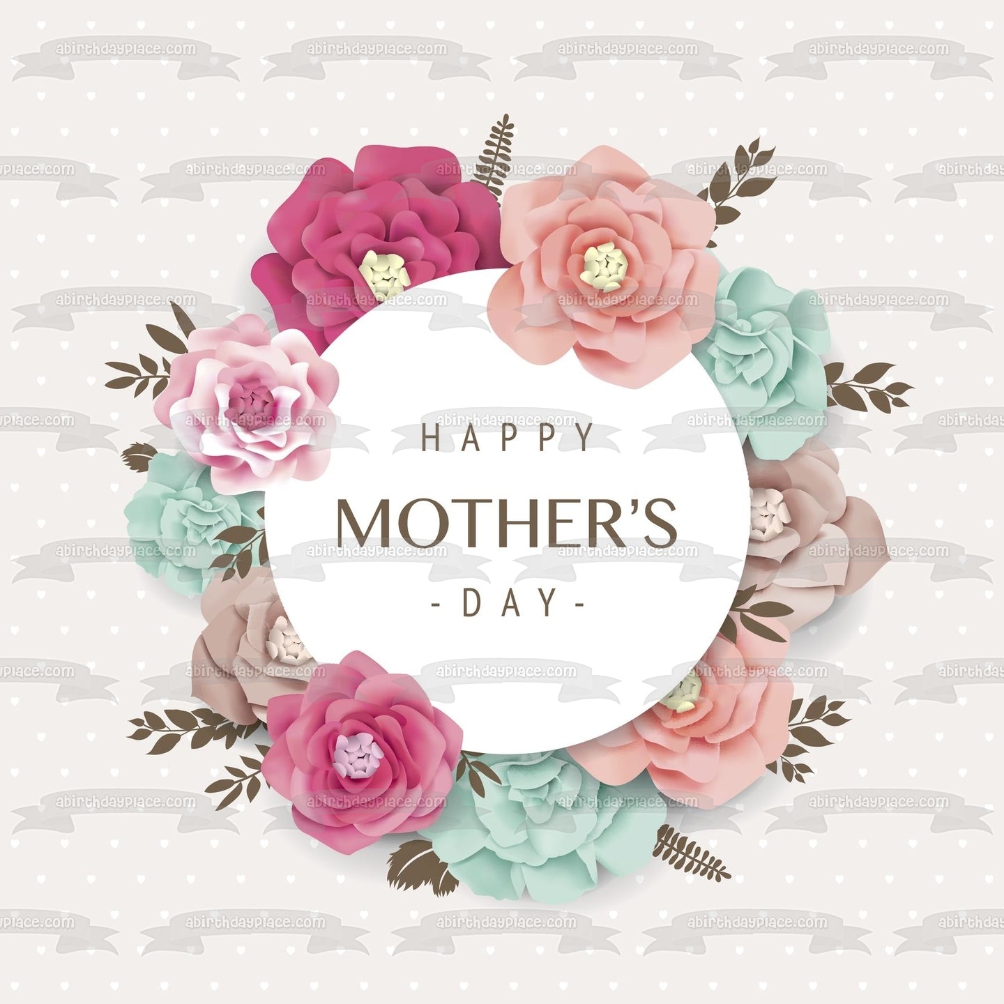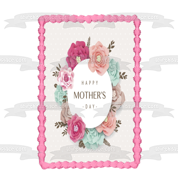 ¡Decora tu pastel con esta imagen de adorno comestible para pastel con temática del Feliz Día de la Madre con flores rosadas y azules!