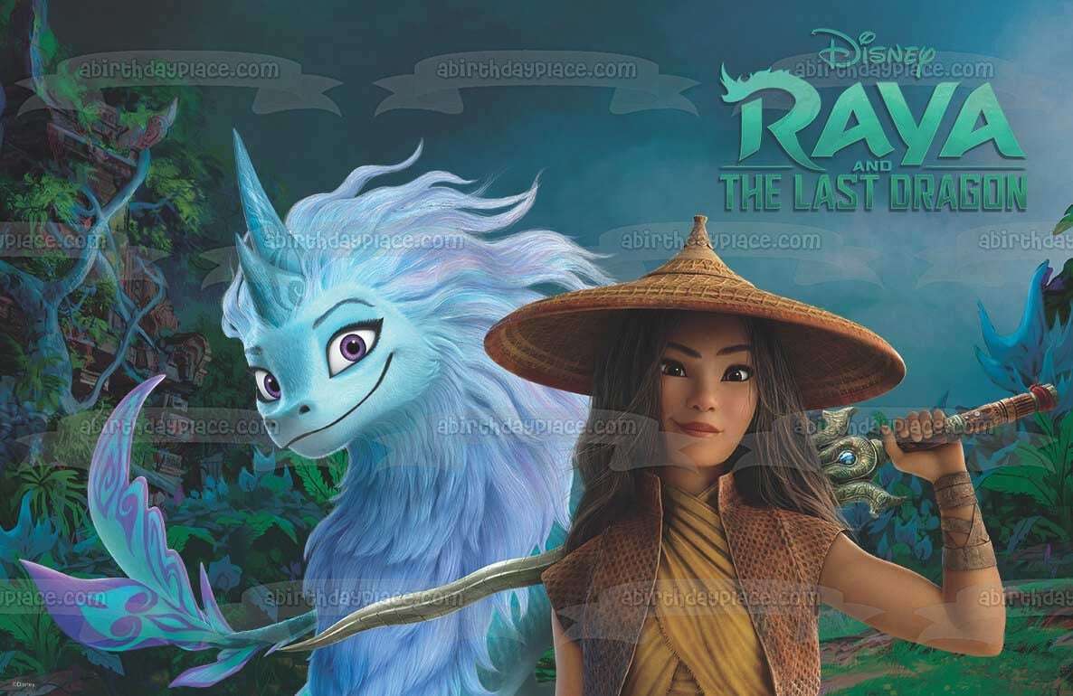 ¡Decora tu pastel con esta imagen de adorno comestible para pastel con temática de Raya y el último dragón que presenta a Raya y Sisu!